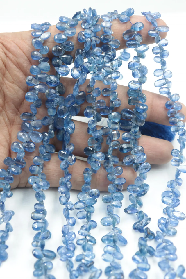 ลูกปัดไคยาไนต์ทรงหยดน้ำเจียระไนธรรมชาติ ขนาด 4*6-5*7 มม. ความยาว 8 นิ้ว รูขนาด 0.40 มม. ร้านอินเดียนเจมสโตร์สำหรับทำเครื่องประดับ