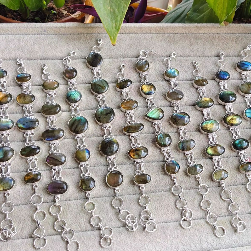 กำไลข้อมือลาบราดอไรต์ธรรมชาติขัดเงาปรับขนาดได้สำหรับผู้หญิง ทำด้วยมือจากอัญมณีคริสตัลประดับลูกปัด เครื่องประดับบำบัดรักษา ของขวัญแทนใจ
