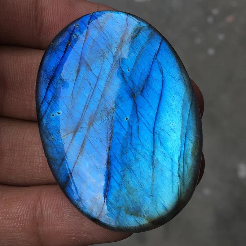 พลอยลาบราดอไรต์ทรงรีธรรมชาติ สีฟ้าสดใส ขัดเงาสองด้าน เกรดพรีเมียม รับรองโดยผู้เชี่ยวชาญ สำหรับผู้หญิง