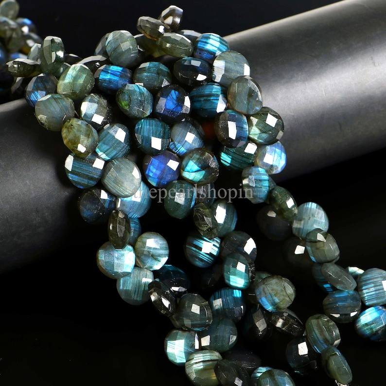 ลูกปัดลาบราดอไรต์ทรงหัวใจเหลี่ยมเพชรพลอยธรรมชาติ ขนาด 11-12 มม. สีฟ้าประกาย ลูกปัดพลอยลาบราดอไรต์สำหรับทำเครื่องประดับ ความยาว 8 นิ้ว