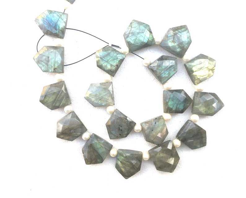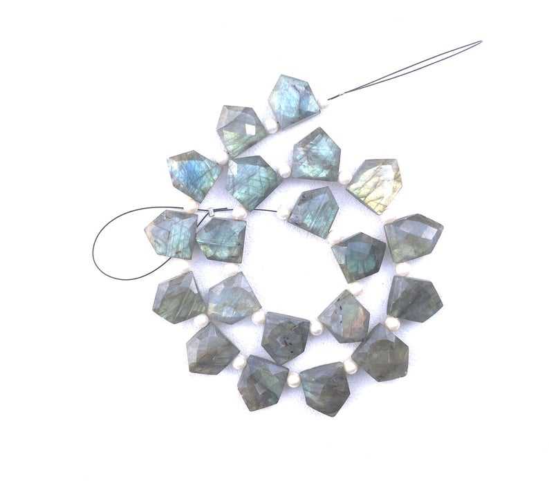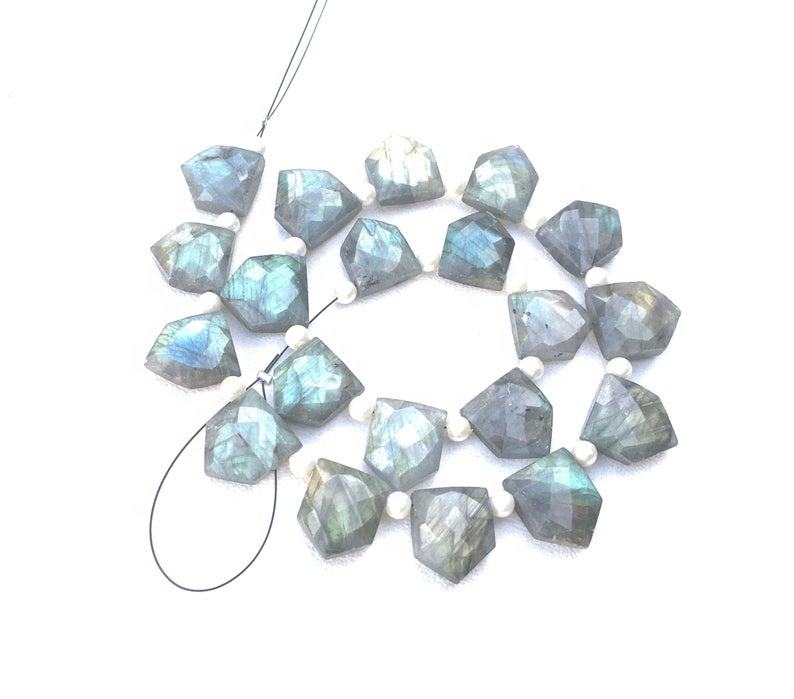 หินลาบราดอไรต์ธรรมชาติ19ชิ้นรูปทรงห้าเหลี่ยมเหลี่ยมเพชรพลอยไฟสีฟ้าทำเครื่องประดับหินแต่งสวน