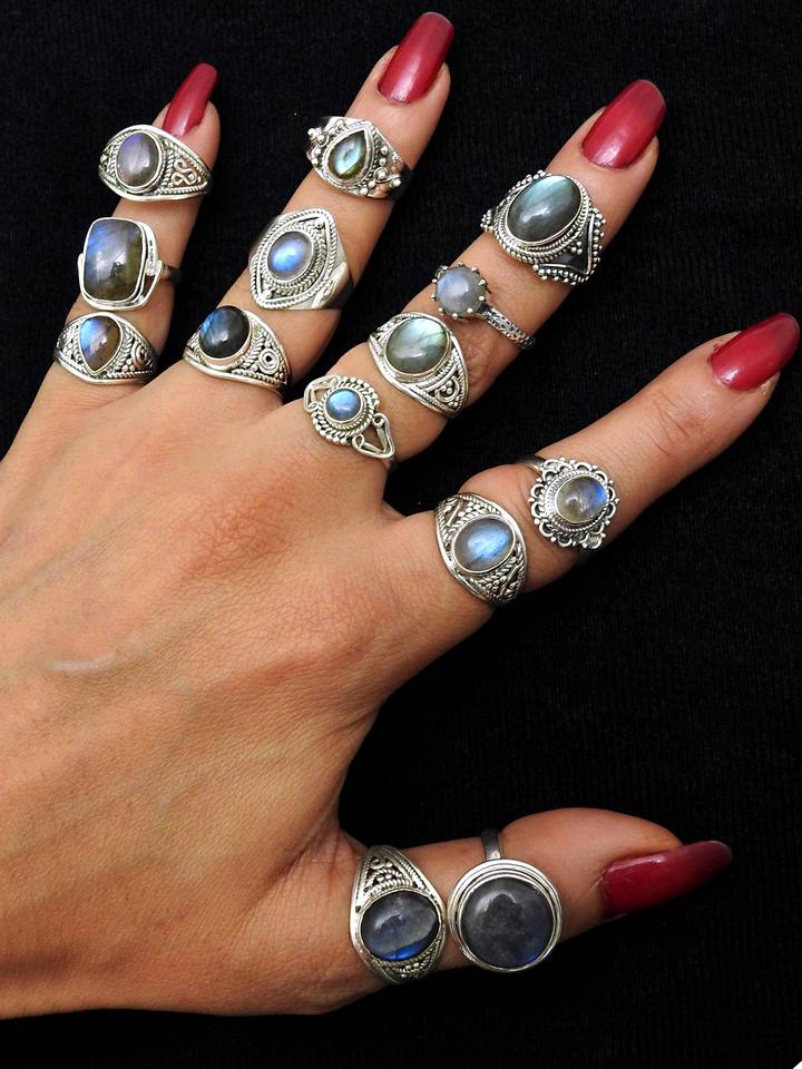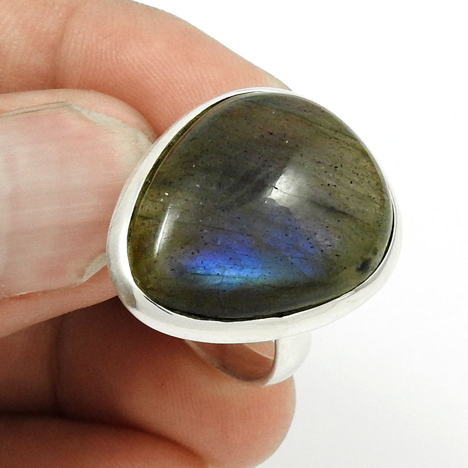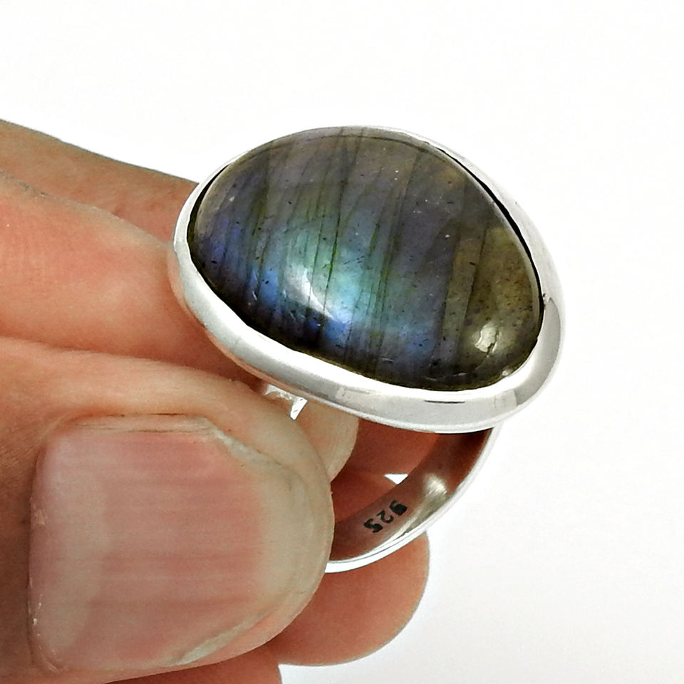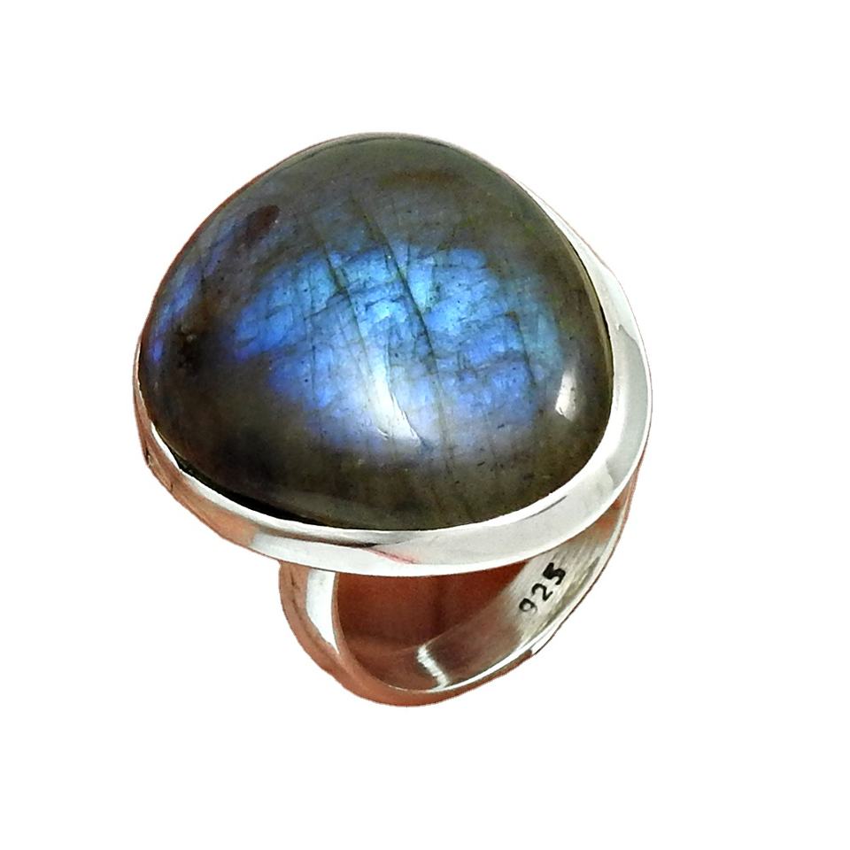 925พลอยลาบราดอไรต์ธรรมชาติแหวนเงินทรงหลังเบี้ยทรงอินเดียออกแบบตามคำสั่งซื้อผู้ผลิตเครื่องประดับผู้ส่งออก