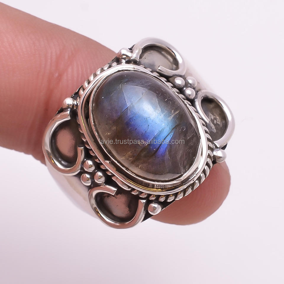 แหวนลาบราดอร์ไทต์ธรรมชาติ เครื่องประดับเงิน 925 เงินสเตอร์ลิง ขายส่งเครื่องประดับแฮนด์เมด แหวนเงินดี ซัพพลายเออร์