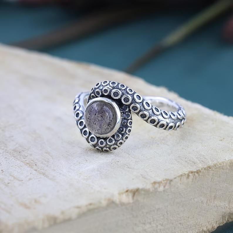 Natural Labradorite Ring Sterling Silver Oxidized Jewelry Fantasy Ocean Blue Flashy Healing Ring for Her