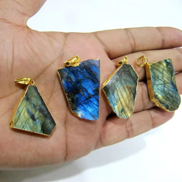 จี้ชิ้นลาบราดอไรต์ธรรมชาติมีเสน่ห์แบบอิสระพร้อมขั้วต่อแบบห่วงเดี่ยวขอบชุบทองด้วยไฟฟ้าขนาด1นิ้ว