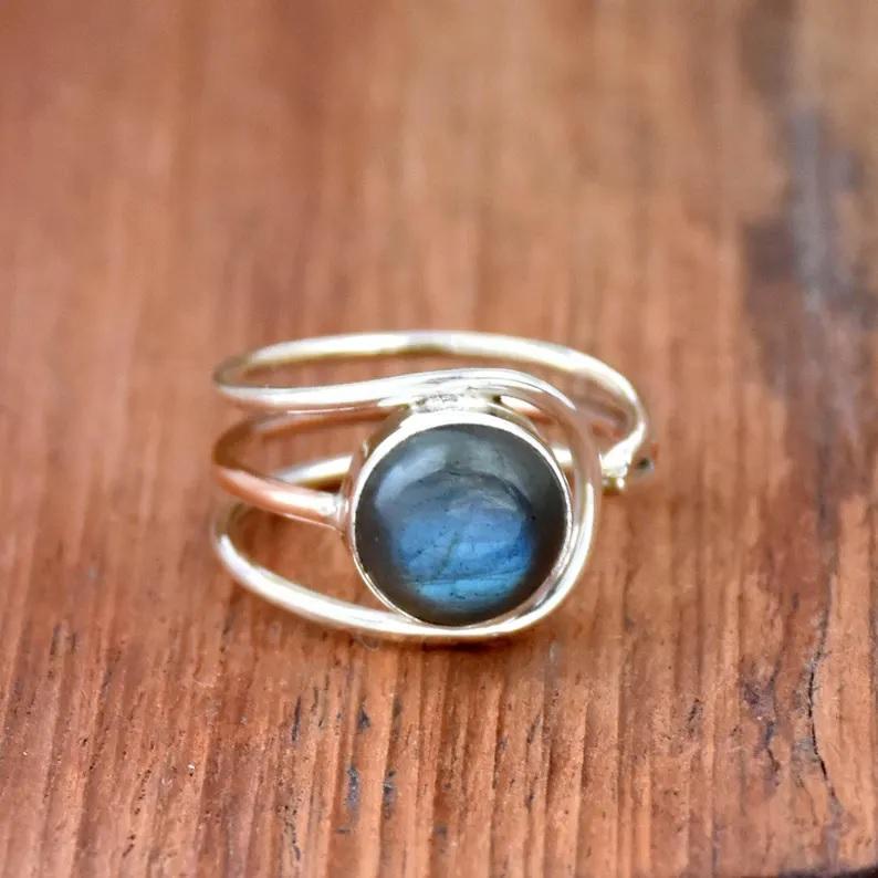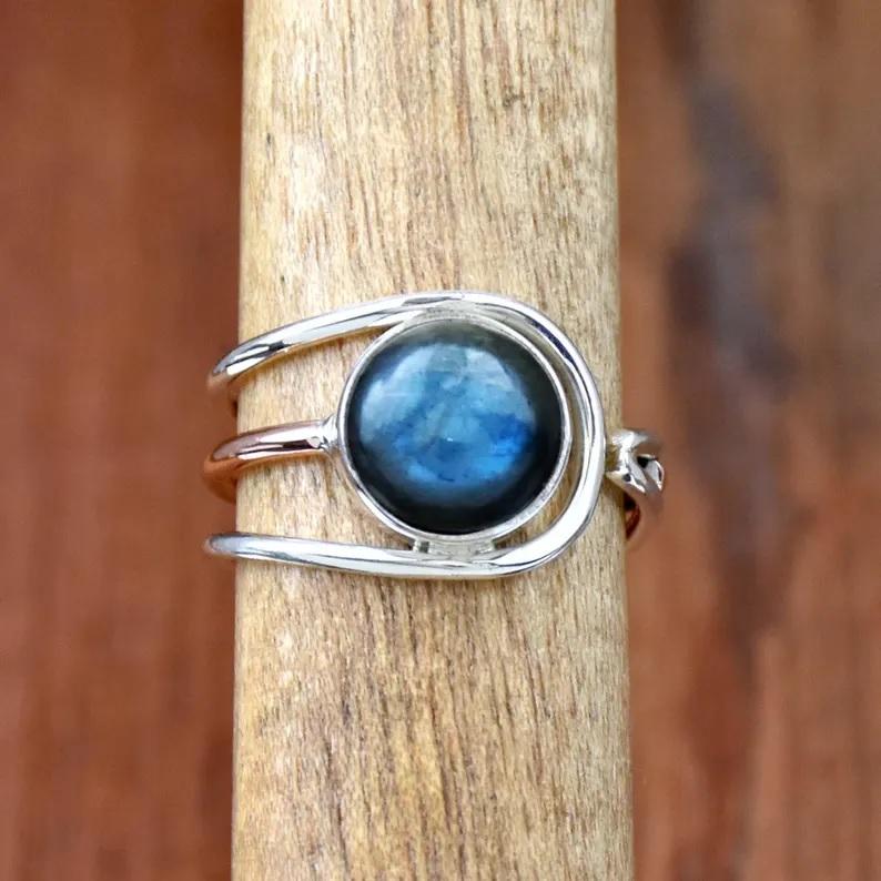 แหวนที่สามารถปรับได้สำหรับลาบราดอไรต์ธรรมชาติทำด้วยมือ925เงินสเตอร์ลิงโบฮีเมียนเครื่องประดับอัญมณีทรงกลม