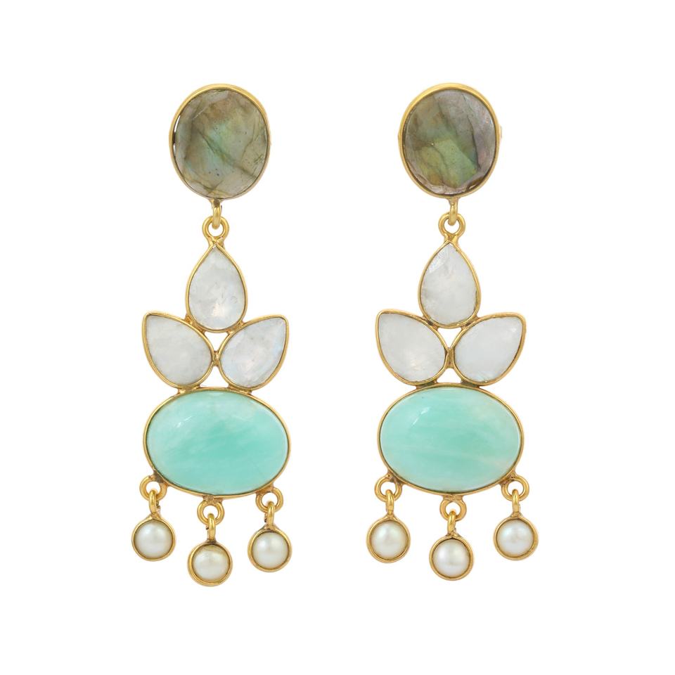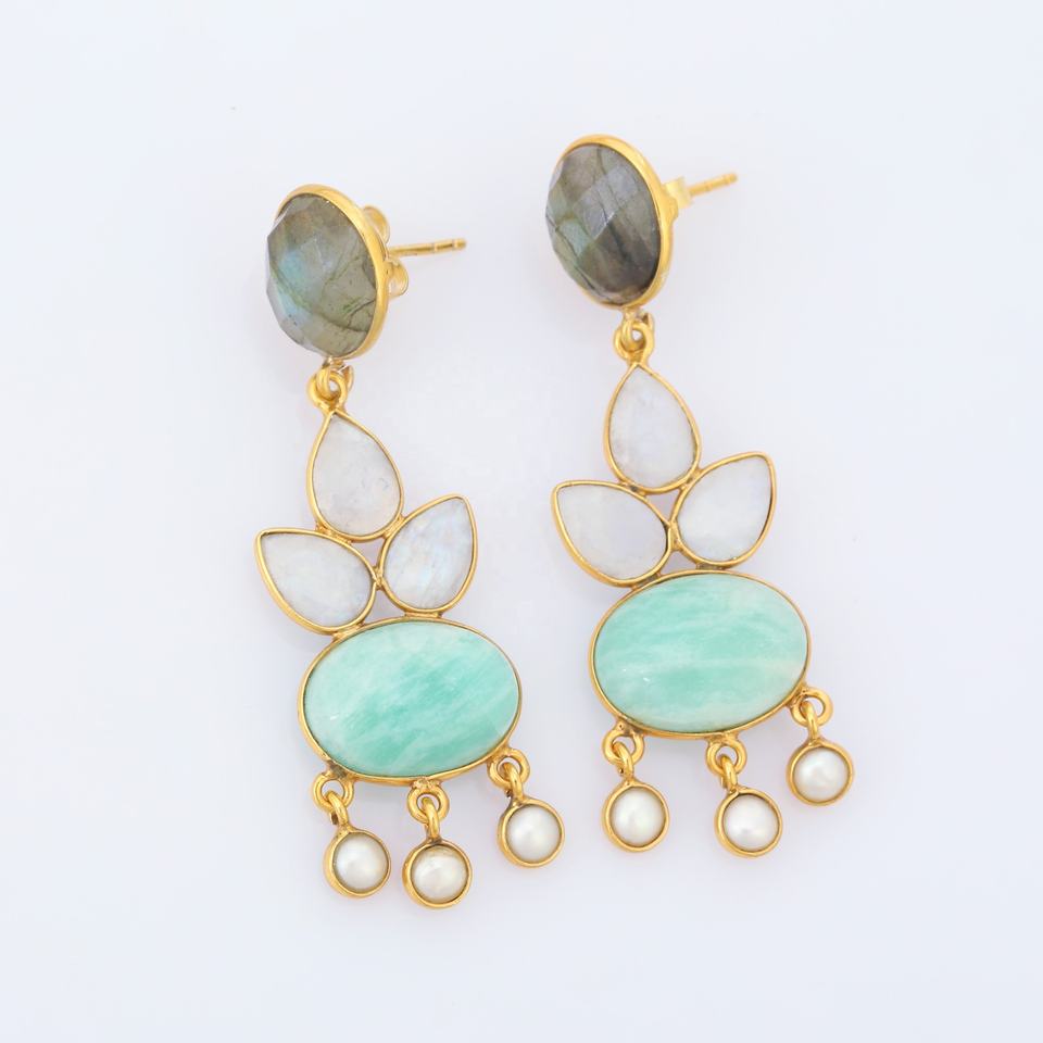 ต่างหูชุบทอง18K 925ไข่มุกน้ำแร่ลาบราดอไรต์ธรรมชาติและโบว์ฝนสีขาว