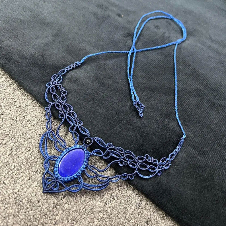 สร้อยคอมาคราเม่ลาพิสลาซูลีธรรมชาติ ทำด้วยมือ สไตล์โบโฮ จี้ปรับได้ เครื่องประดับถักสีน้ำเงิน