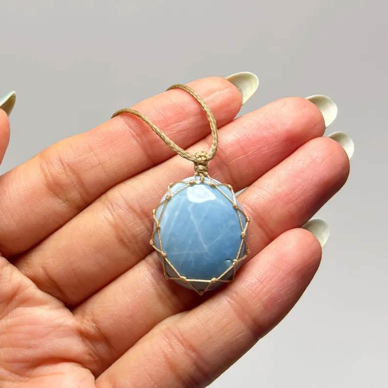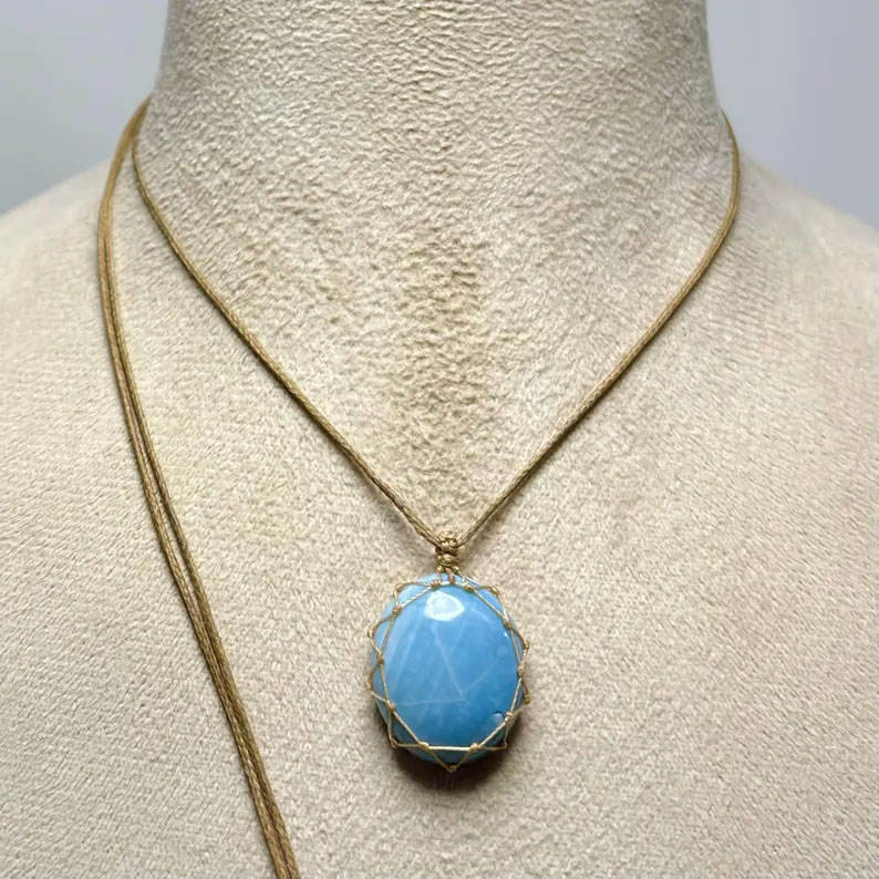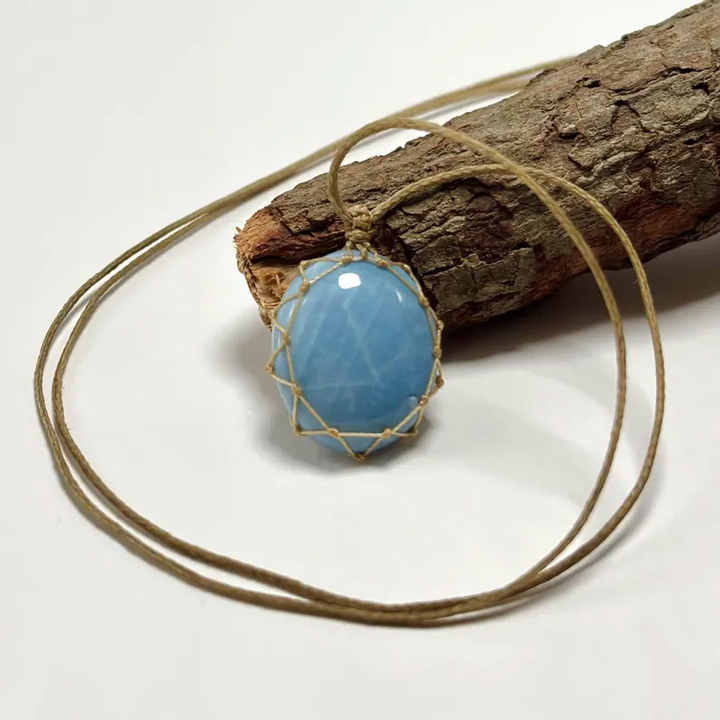 จี้หินลาริมาร์สีน้ำเงินธรรมชาติทรงมรกต ทำจากโลหะผสมสังกะสี พร้อมเชือกถักแบบมาคราเม่ สร้อยคอทำมือสไตล์โบโฮ เครื่องประดับคริสตัลบำบัดรักษา ของขวัญวันครบรอบ