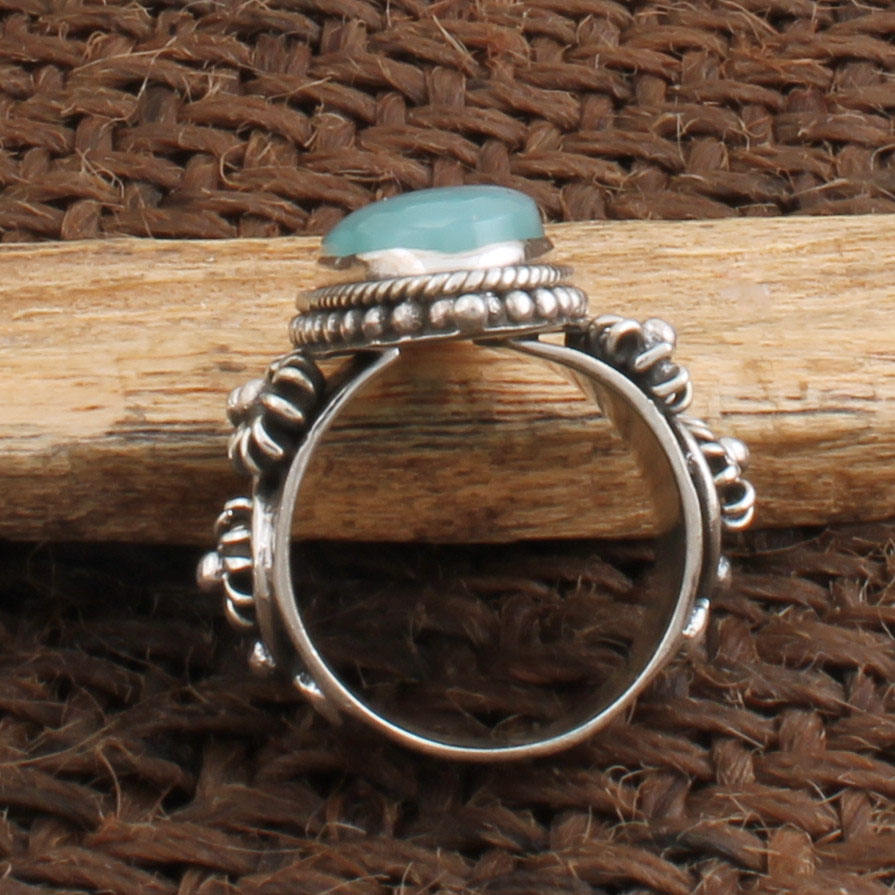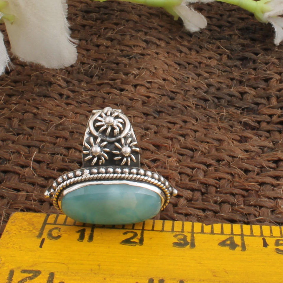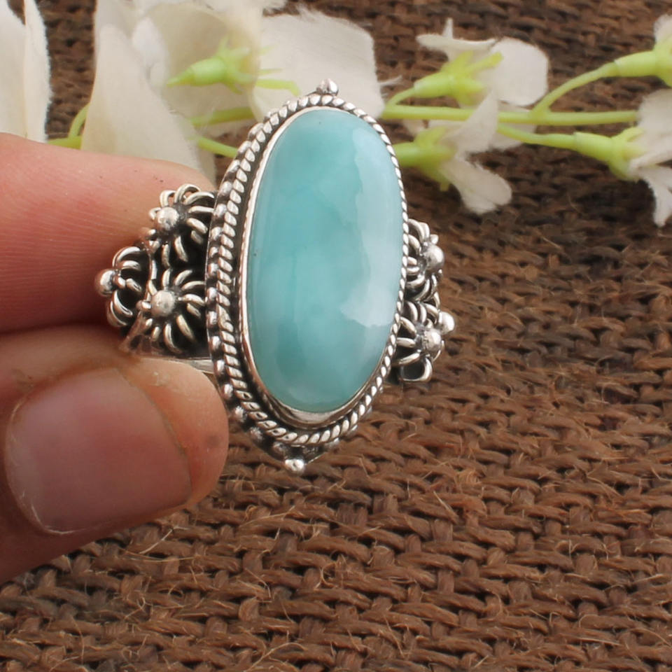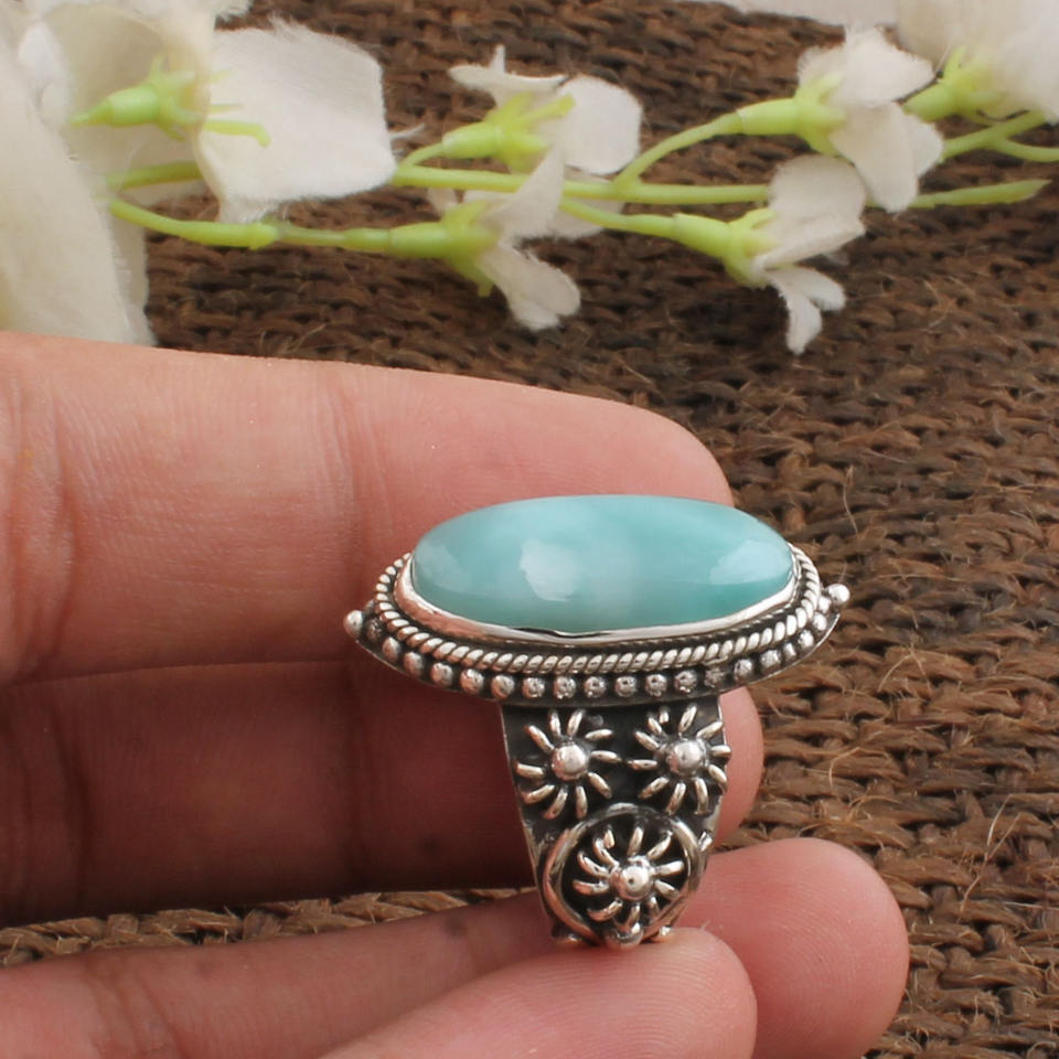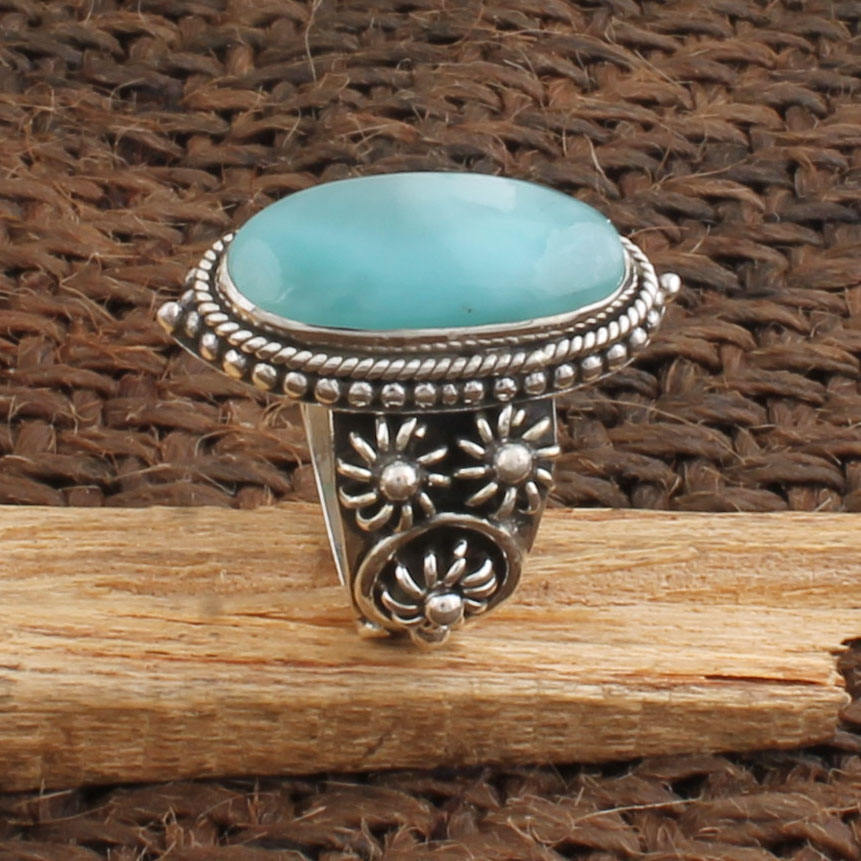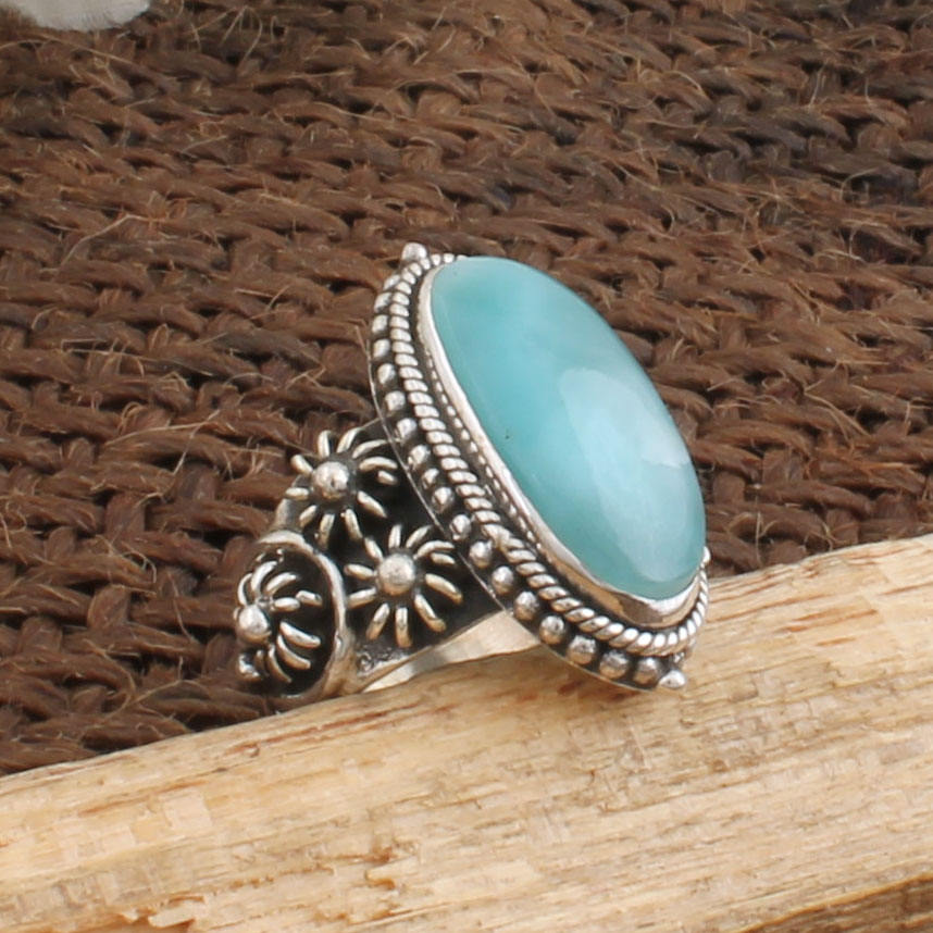แหวนลาริมาร์ธรรมชาติ เงินแท้ 925 ประดับพลอยสีน้ำเงินแคริบเบียน รูปทรงกลีบดอกไม้ งานแฮนด์เมด แหวนพลอยสำหรับผู้หญิง ของขวัญ