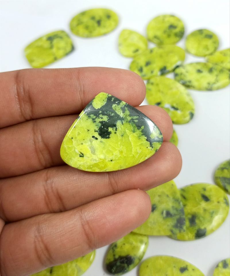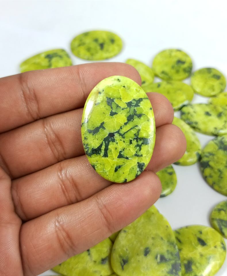 พลอยลาซิไดต์ธรรมชาติแบบขายส่ง รูปทรงคาโบชอง สีเขียวควอตซ์ สำหรับทำเครื่องประดับ รูปทรงผสมผสานเรียบเนียน มีคุณสมบัติบำบัดรักษา