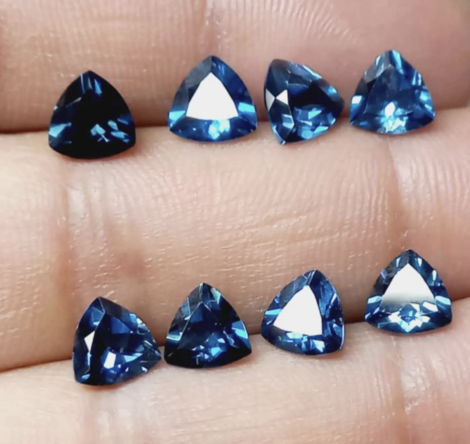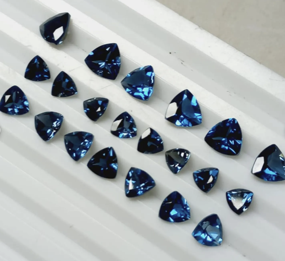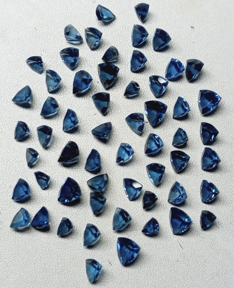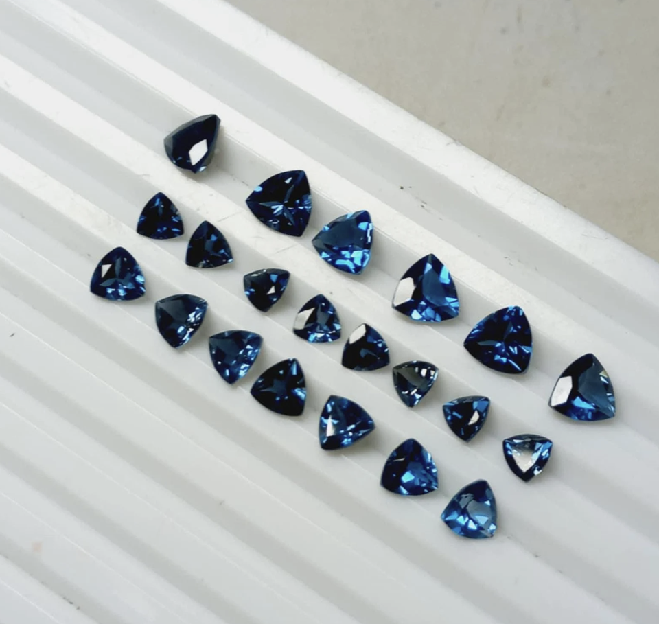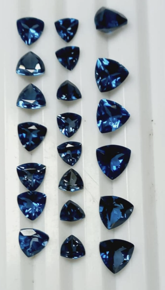 พลอยโทแพซลอนดอนบลูธรรมชาติทรงสามเหลี่ยมเจียระไนแบบทริลเลียน ได้รับการรับรองสำหรับทำเครื่องประดับ ขนาด 3 มม. ถึง 15 มม.