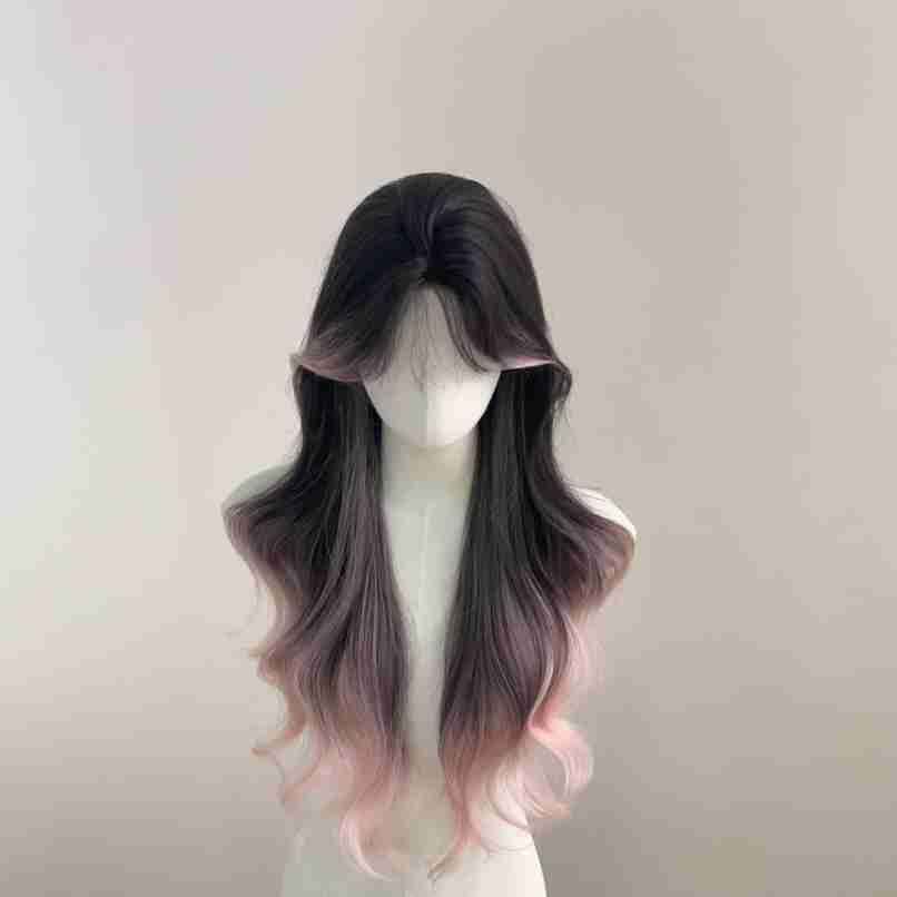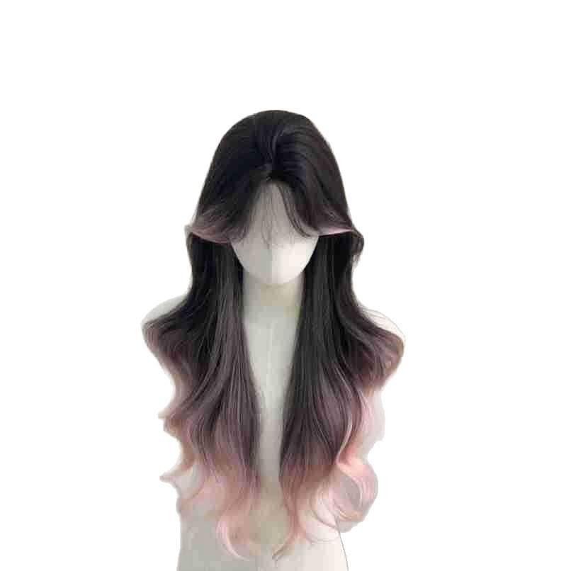 วิกผมยาวหยิกธรรมชาติ พร้อมหน้าม้าปัดข้าง สีชมพู ย้อมสีตรงกลาง แสกกลาง วิกผมสังเคราะห์แบบเต็มศีรษะ สำหรับผู้หญิง