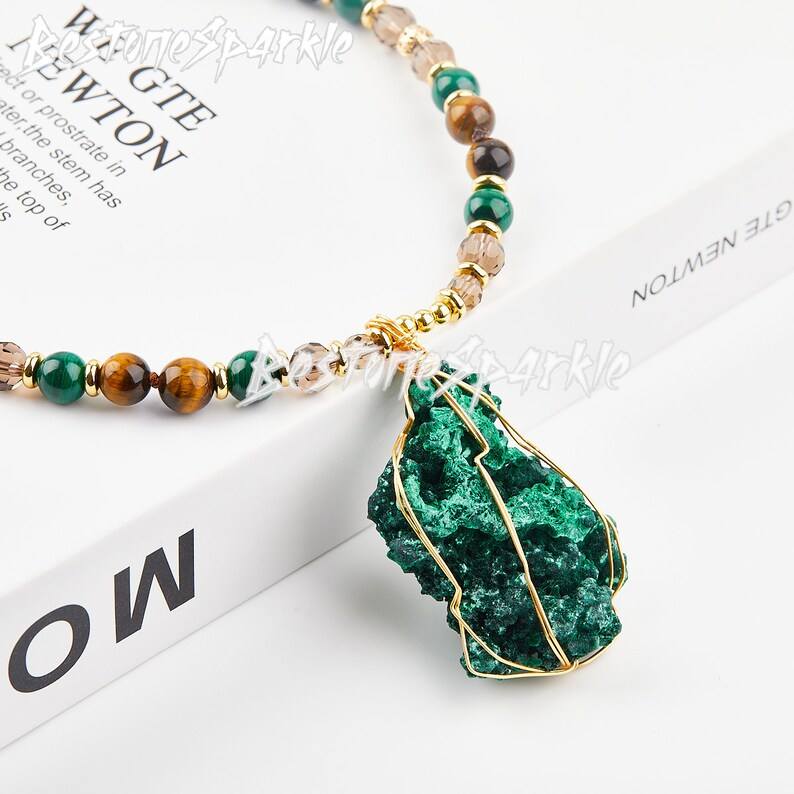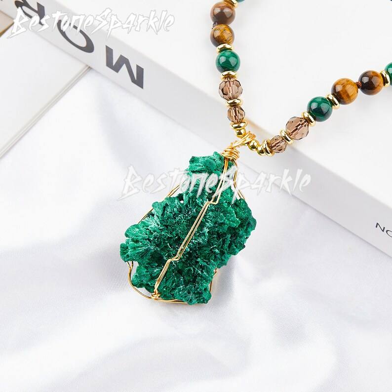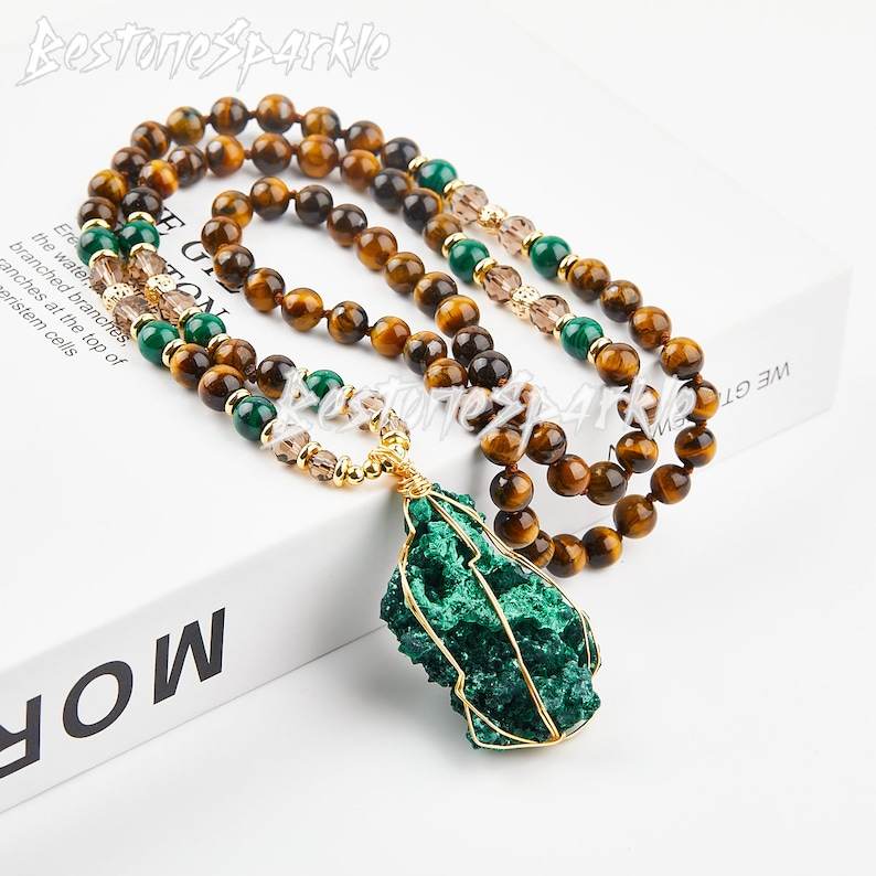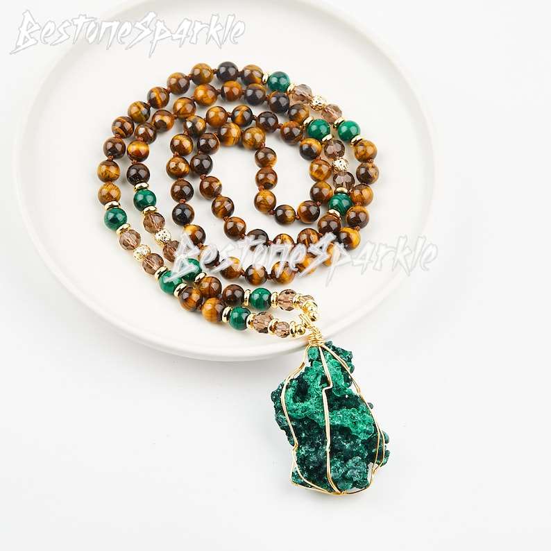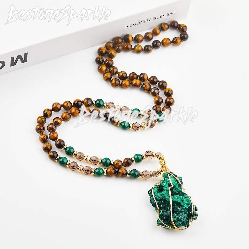 สร้อยคอจี้มาลาไคต์ธรรมชาติผูกปมด้วยพลอยตาเสือเครื่องประดับรักษาที่ทำด้วยมือด้วยพลังงาน