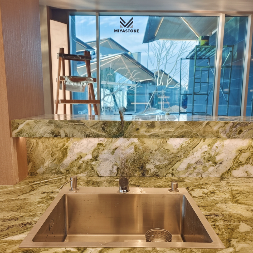 แผ่นหินอ่อนธรรมชาติติดผนังสำหรับเฟอร์นิเจอร์กลางแจ้งม้านั่งในสวนริมสระน้ำเคาน์เตอร์ลานบ้านโต๊ะ