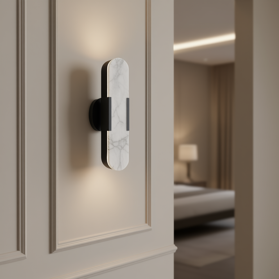 โคมไฟติดผนังหินอ่อนธรรมชาติ 19.7 นิ้ว โคมไฟติดผนัง LED สีดำทันสมัยสำหรับห้องน้ำ ห้องนั่งเล่น ห้องนอน ทางเดิน บันได ไฟในร่ม