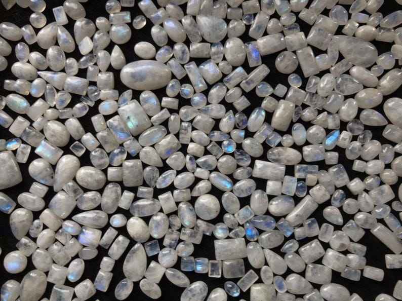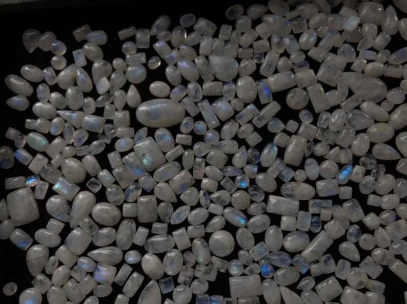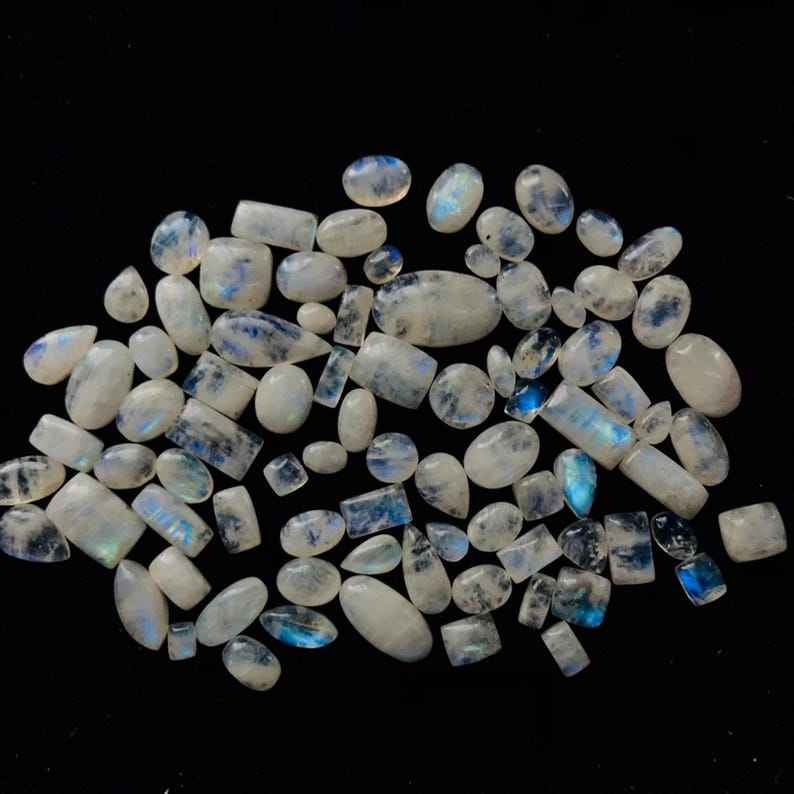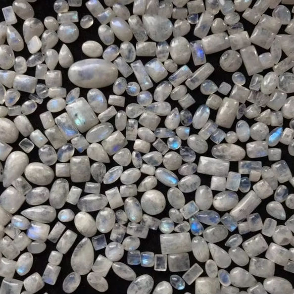 พลอยเทียมขัดแบบหลวมสีรุ้งมูนสโตนธรรมชาติแวววาวสีฟ้าสำหรับทำเครื่องประดับ