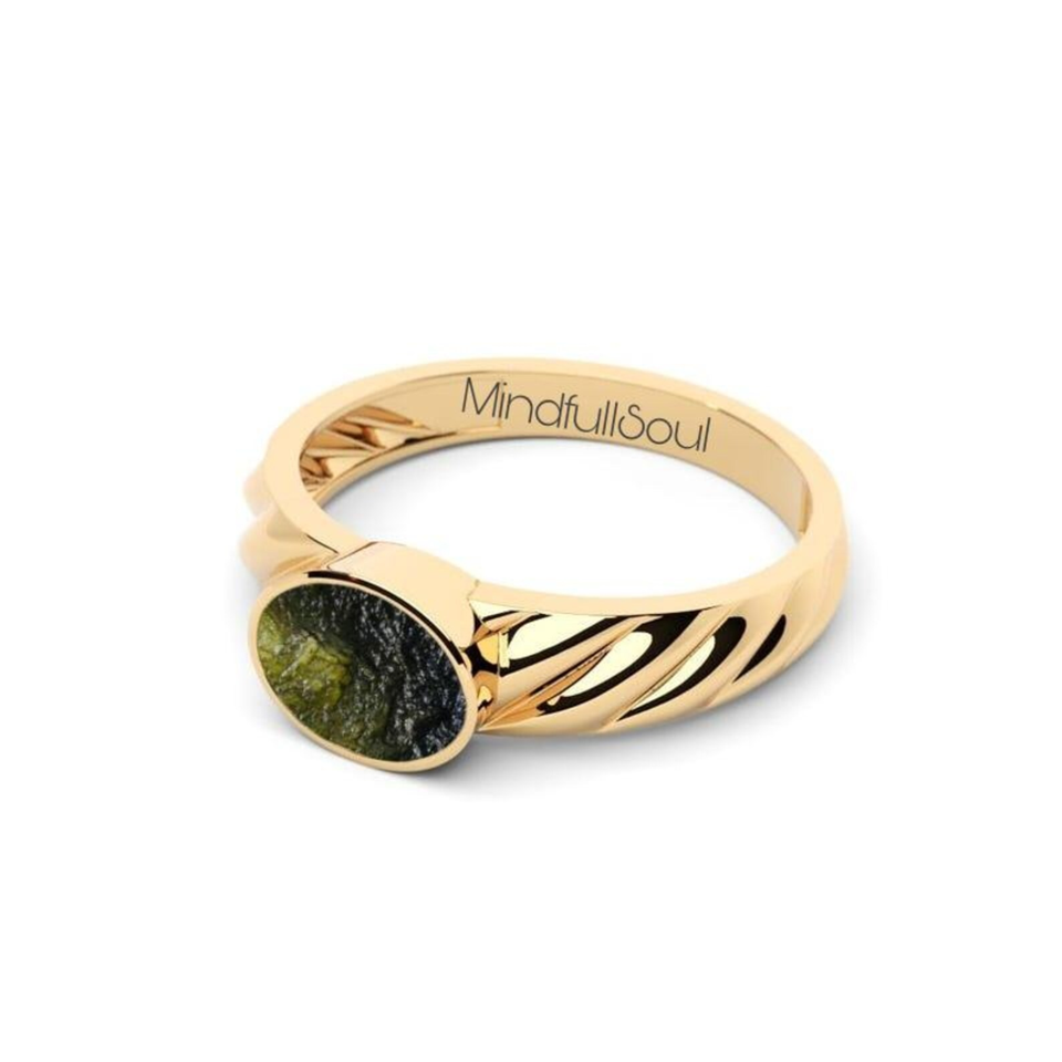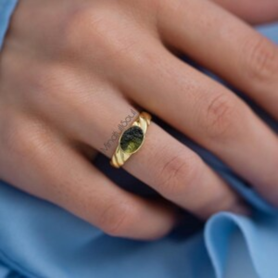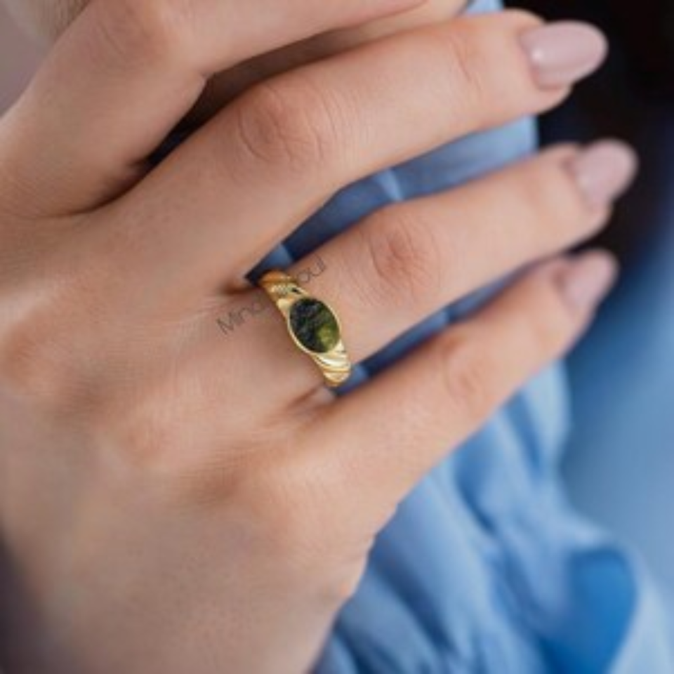 แหวนมอลดาไวต์ธรรมชาติ เกรด A รับรองโดย Chlum สาธารณรัฐเช็ก | เครื่องประดับเงินแท้ 925 | แหวนมอลดาวิทช์ชุบทองคำสีกุหลาบ