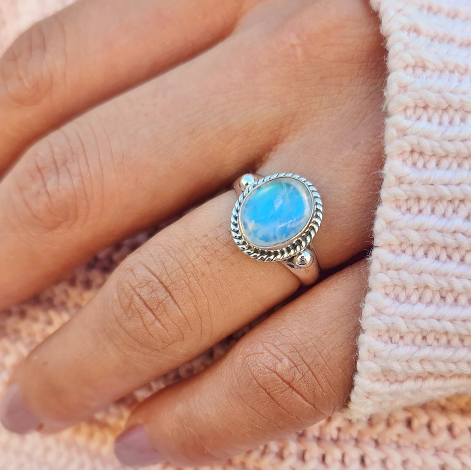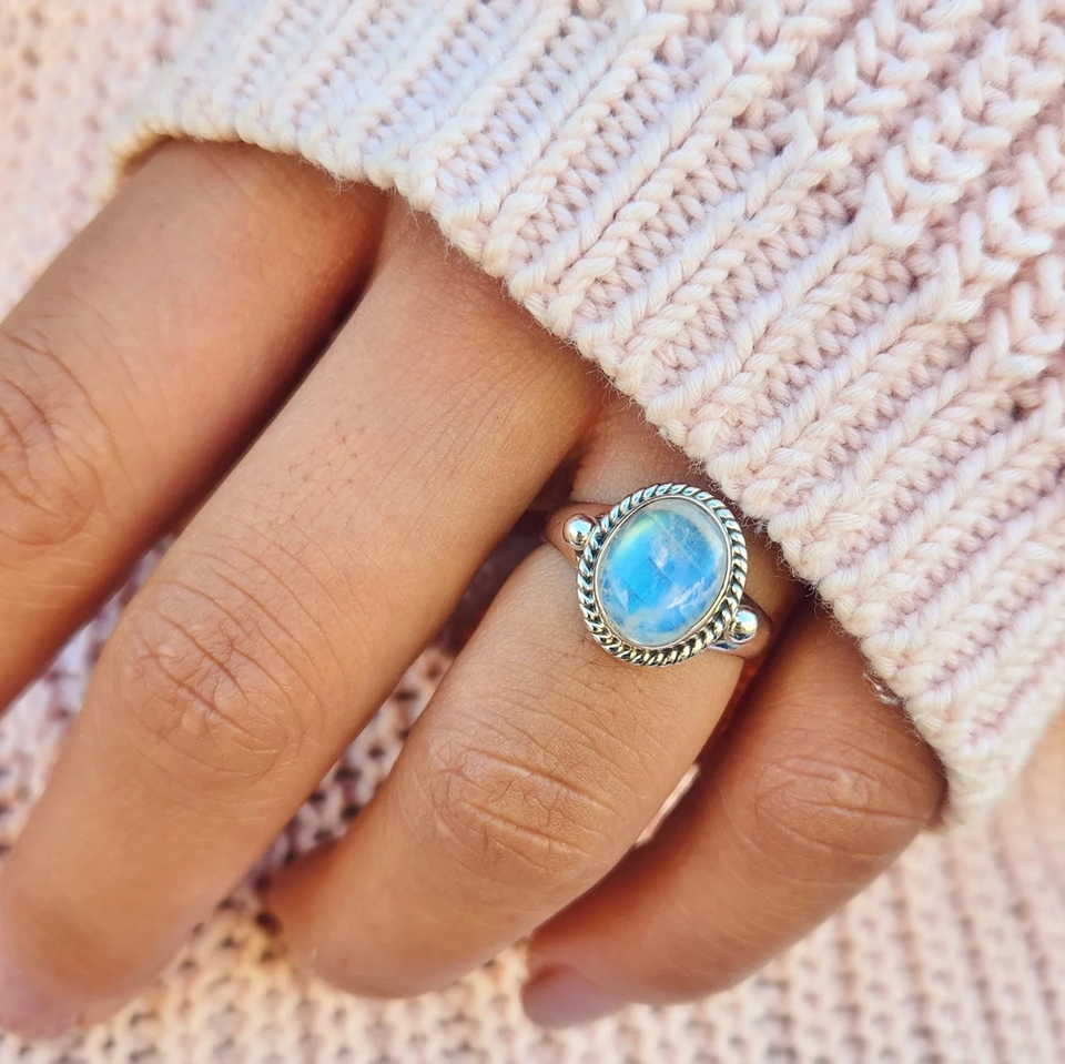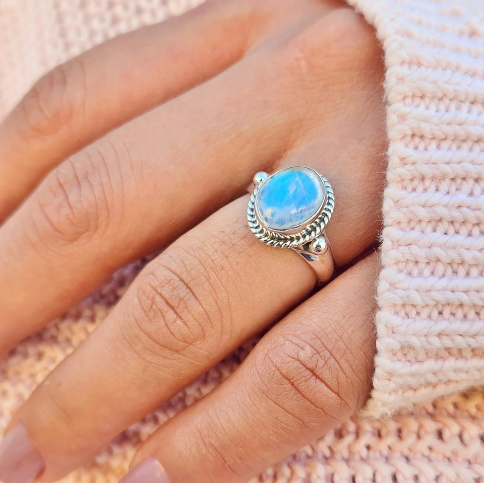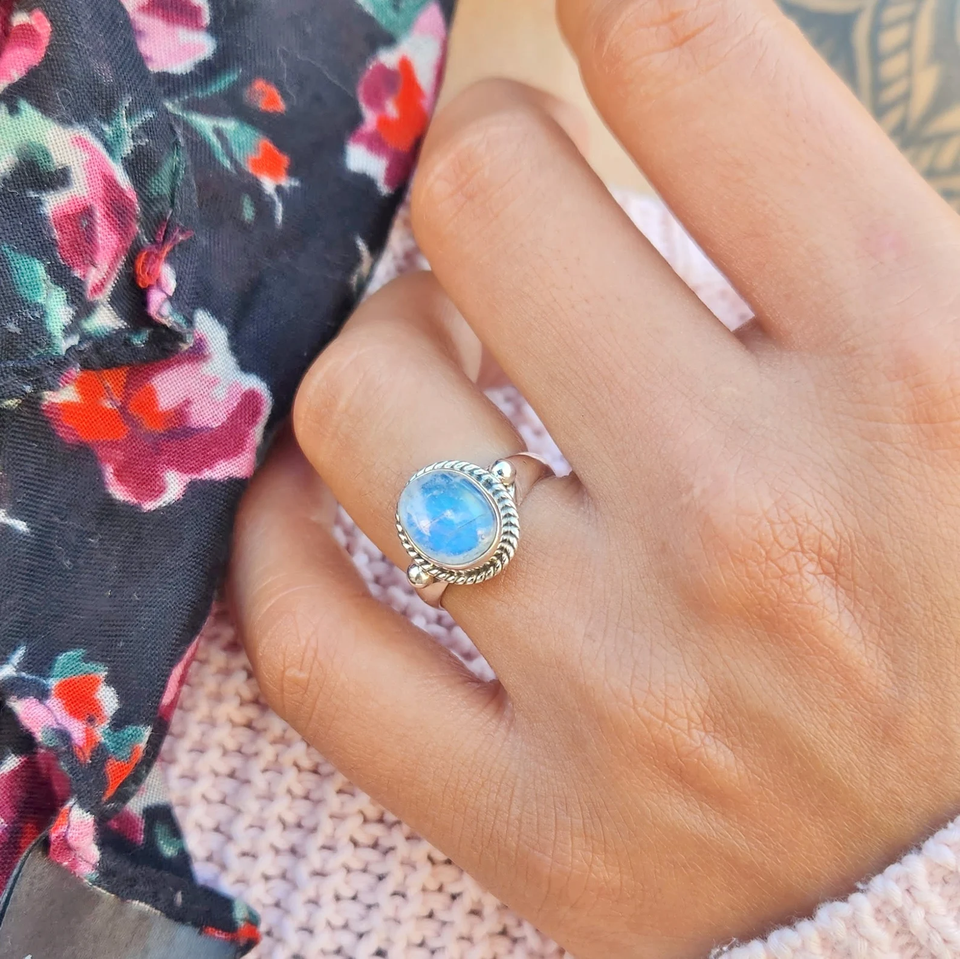 แหวนมูนสโตนธรรมชาติ สไตล์โบโฮ ทำมือ เครื่องประดับพลอยแท้ แหวนเงินแท้ 925 สำหรับผู้หญิง ของขวัญสำหรับเธอ