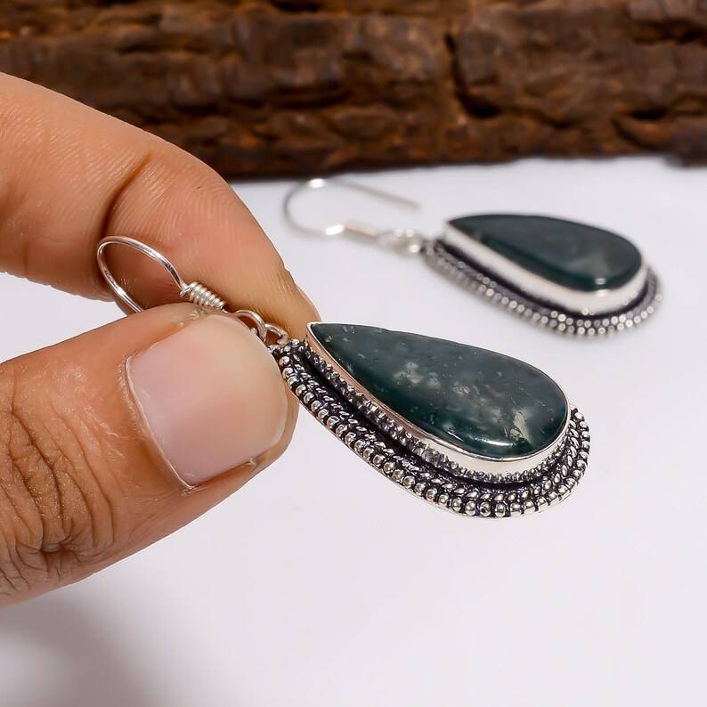 ต่างหูเงินทรงลูกแพร์ประดับมอสอาเกตธรรมชาติ สไตล์วินเทจ เงินแท้ 925 เครื่องประดับทำมือสไตล์โบฮีเมียน ของขวัญสำหรับเธอ