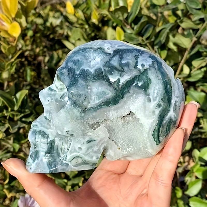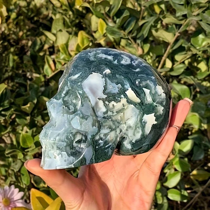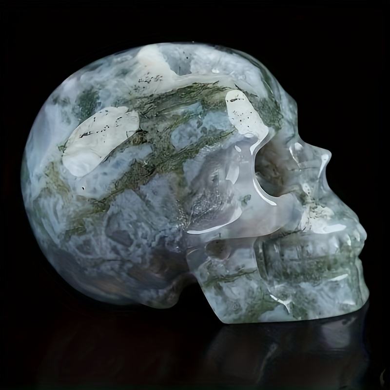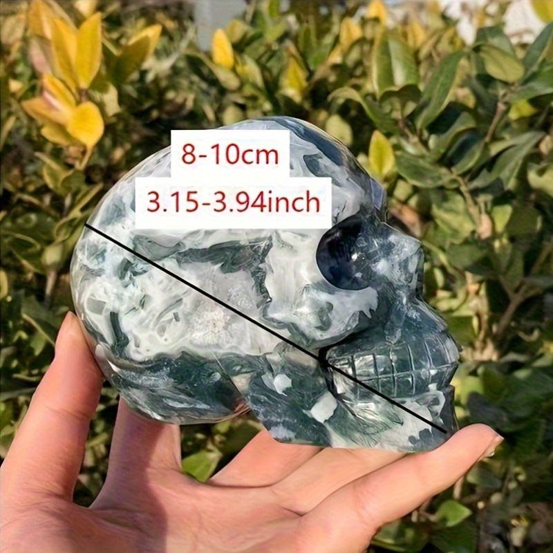 หินมอสอาเกตธรรมชาติรูปหัวกะโหลกแกะสลักด้วยมือ สำหรับการบำบัดด้วยคริสตัล รีกิ การทำสมาธิ การปรับสมดุลจักระ ของตกแต่งบ้าน และของสะสม
