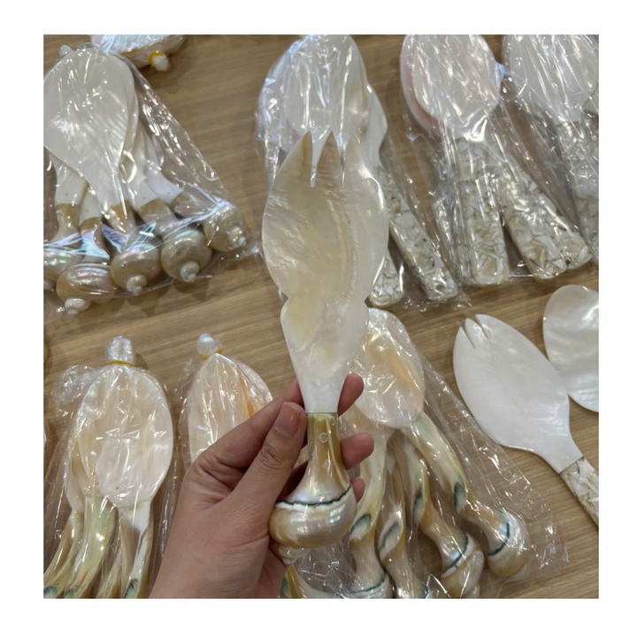 ช้อนและส้อมเปลือกหอยมุกธรรมชาติ ทำด้วยมือ ด้ามจับเปลือกหอย ของตกแต่งบนโต๊ะอาหาร