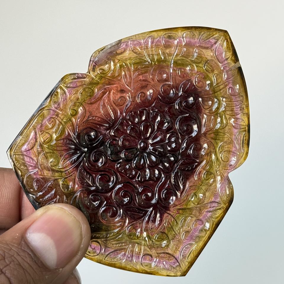 จี้หินทัวร์มาลีนหลากสีธรรมชาติแกะสลักลายดอกไม้แมนดาลา หินทัวร์มาลีนแกะสลักสำหรับทำเครื่องประดับ ขายส่ง
