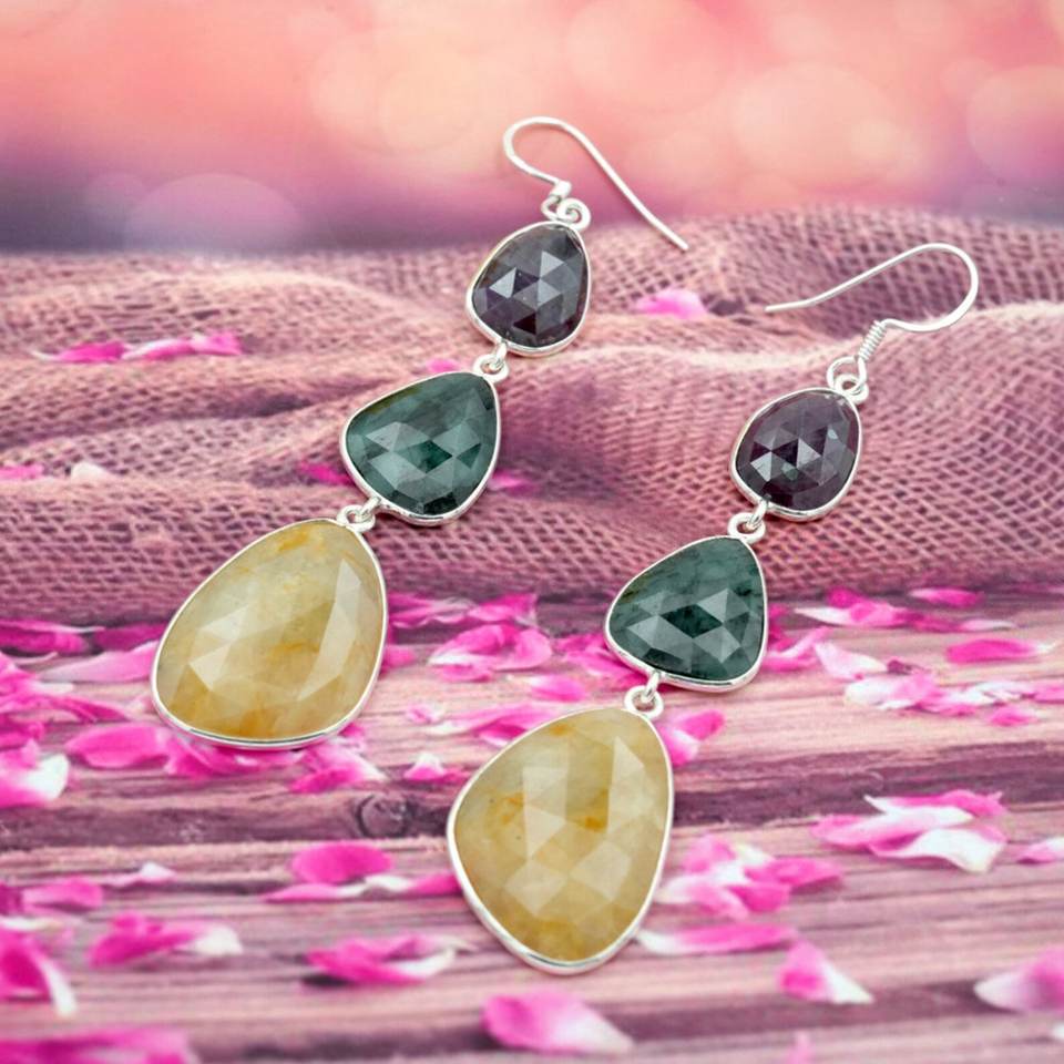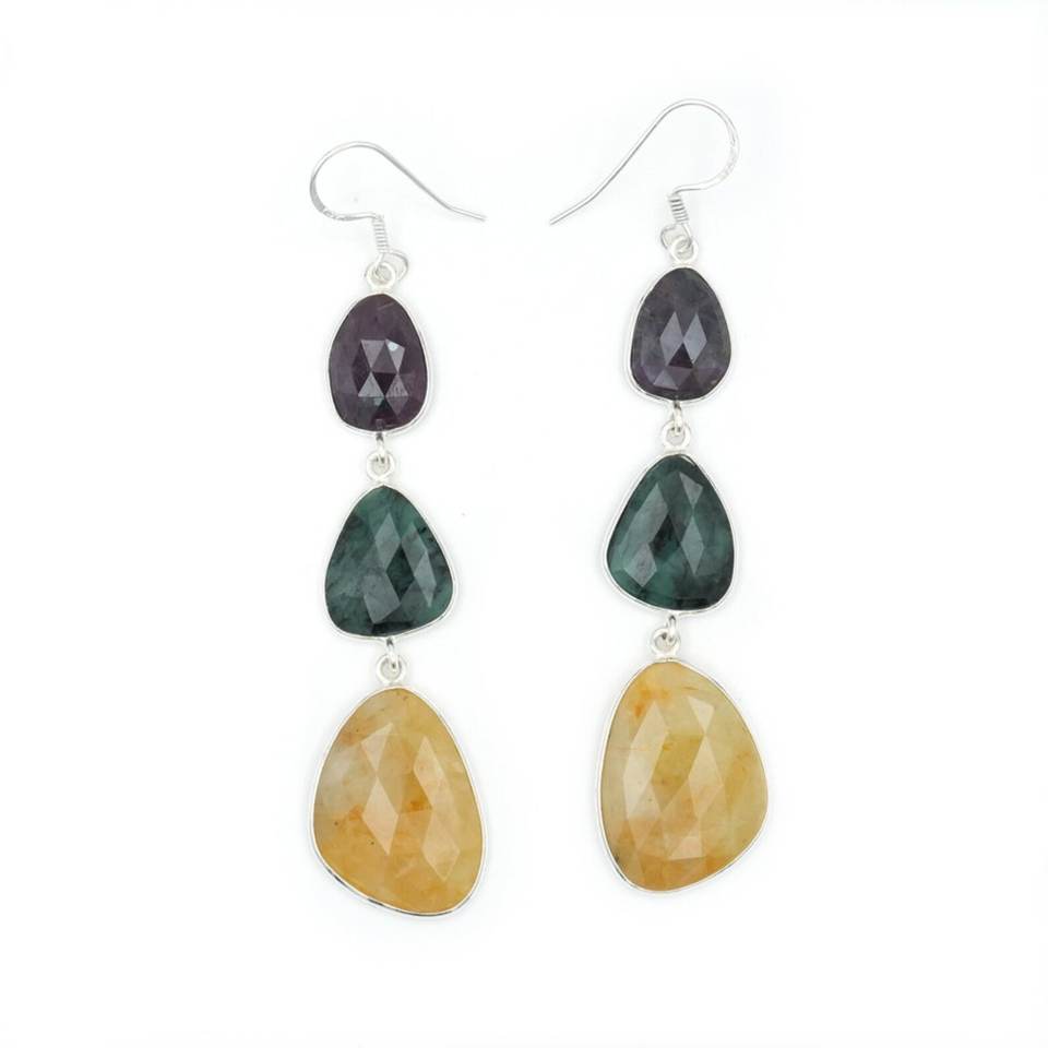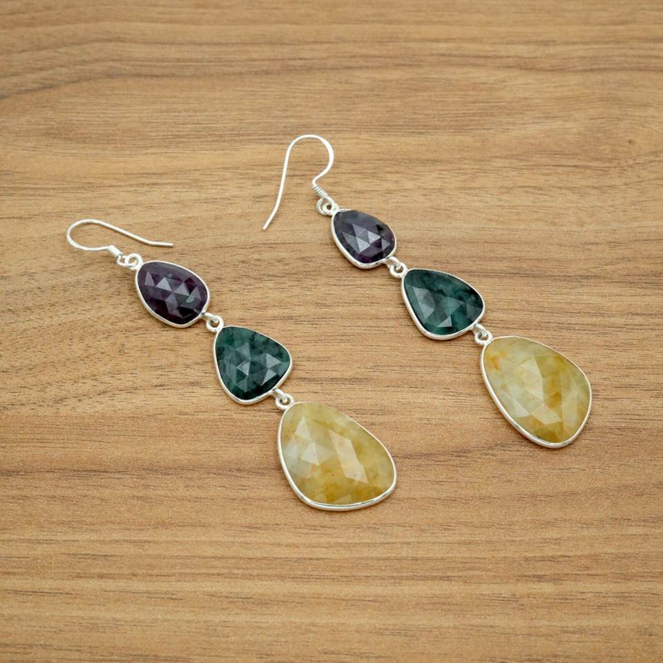 ต่างหู925ไพลินหลายสีธรรมชาติทำจากเงินสเตอร์ลิงพร้อมตัวเรือนพร้อมต่างหูในชุด