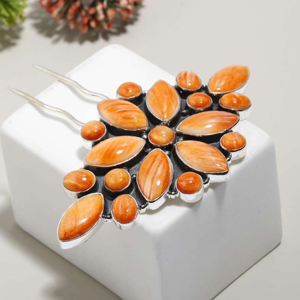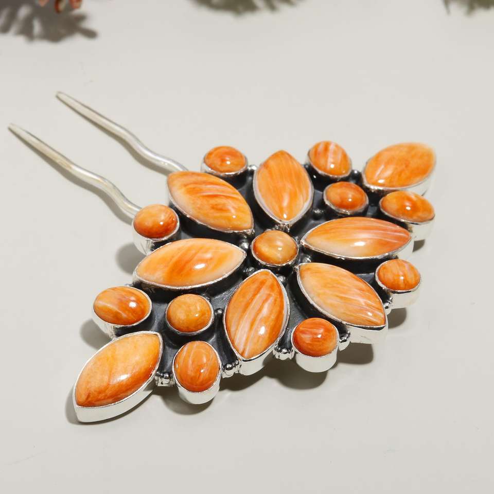 ปิ่นปักผมประดับพลอยหอยนางรมสีส้มธรรมชาติแบบวินเทจทำมือ925สีเงินสเตอลิงนักออกแบบเครื่องประดับกิ๊บติดผม NAVAJO แบบเม็กซิกัน