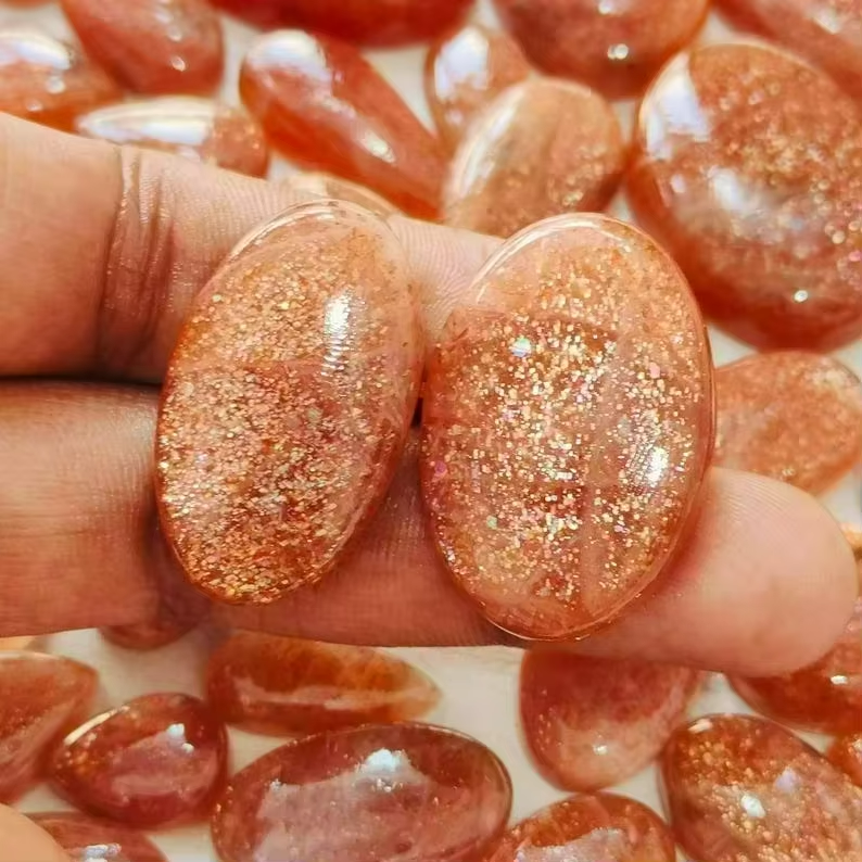 พลอยซันสโตนสีส้มธรรมชาติ รูปทรงผสม แบบคาโบชอง ขัดเงา พลอยซันสโตนขายส่งจำนวนมาก สำหรับทำเครื่องประดับหรือเป็นของขวัญให้เธอ