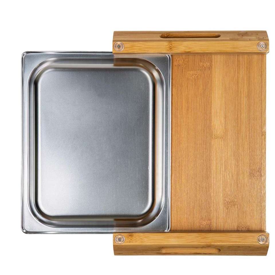 เขียงไม้ไผ่ธรรมชาติออร์แกนิกหรูหราพร้อมเคลือบแล็คเกอร์เป็นมิตรกับสิ่งแวดล้อมร่องน้ำและลิ้นชักถาดสแตนเลสแบบเลื่อน