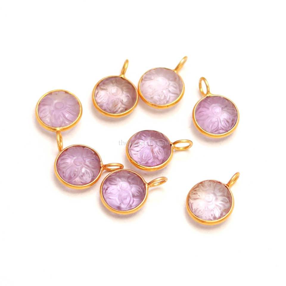 จี้รูปดอกไม้แกะสลักจากอเมทิสต์สีชมพูธรรมชาติ ชุบทองคำเวอร์เมล์ เงินแท้ 925 ประดับอเมทิสต์ คริสตัลบำบัด เครื่องประดับอัญมณี