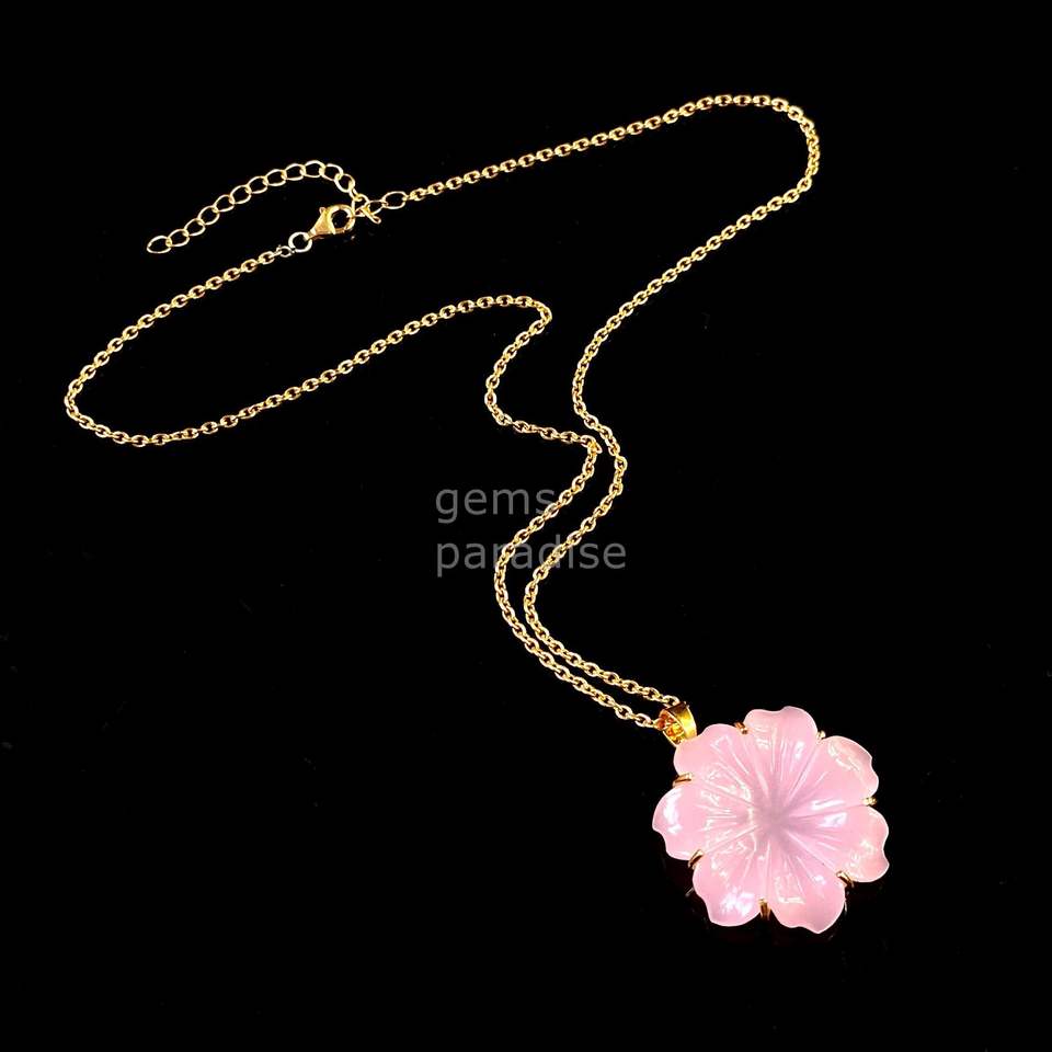 จี้สร้อยคอรูปดอกไม้สีชมพูธรรมชาติประดับด้วยพลอยแคลเซโดนีแกะสลักด้วยมือสำหรับผู้หญิง จี้คริสตัลรูปดอกไม้ทำด้วยมือ