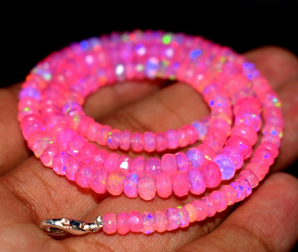 สร้อยคอลูกปัดโอปอลแบบเหลี่ยมเพชรพลอยสีชมพูเอทิโอเปียธรรมชาติขนาด4-5มม. สำหรับทำเครื่องประดับโอปอลอัญมณีขายส่งจำนวนมาก