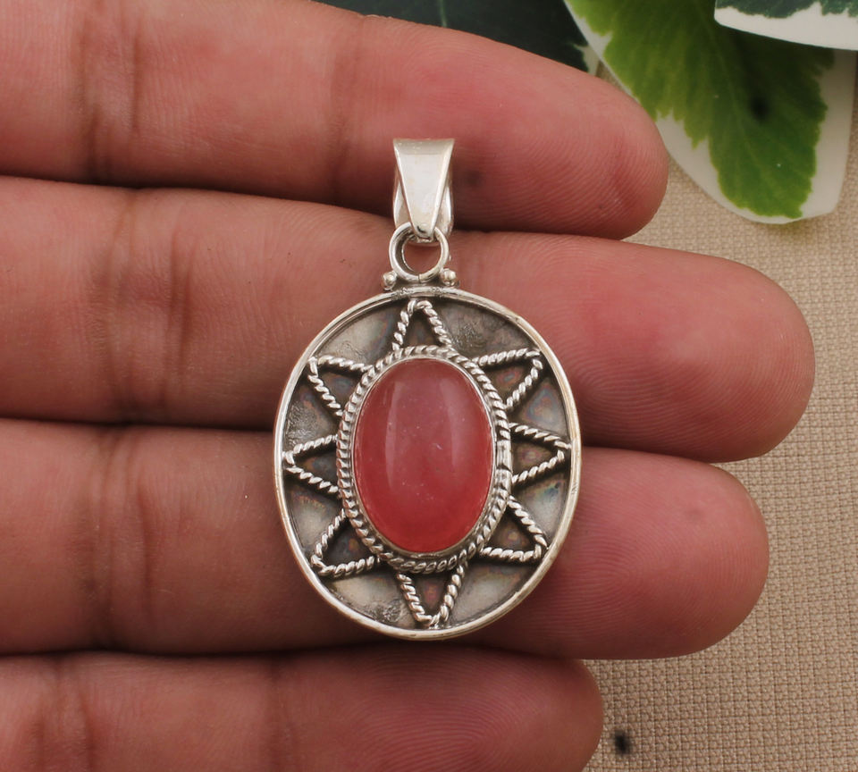 จี้หยกสีชมพูธรรมชาติ 925 เงินสเตอร์ลิงชุบทองคำขาวทำด้วยมือวินเทจสร้อยคอพลอยยูนิเซ็กส์เครื่องประดับช่างฝีมือสุดหรู