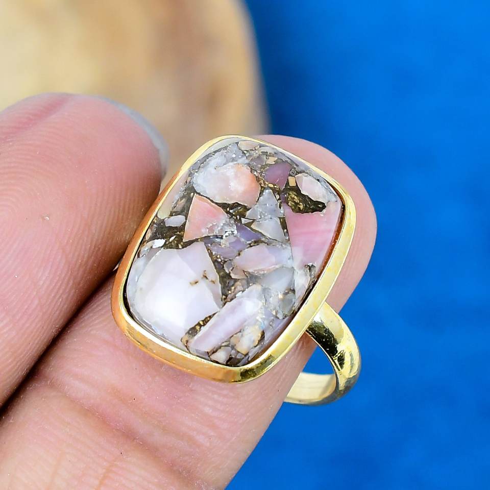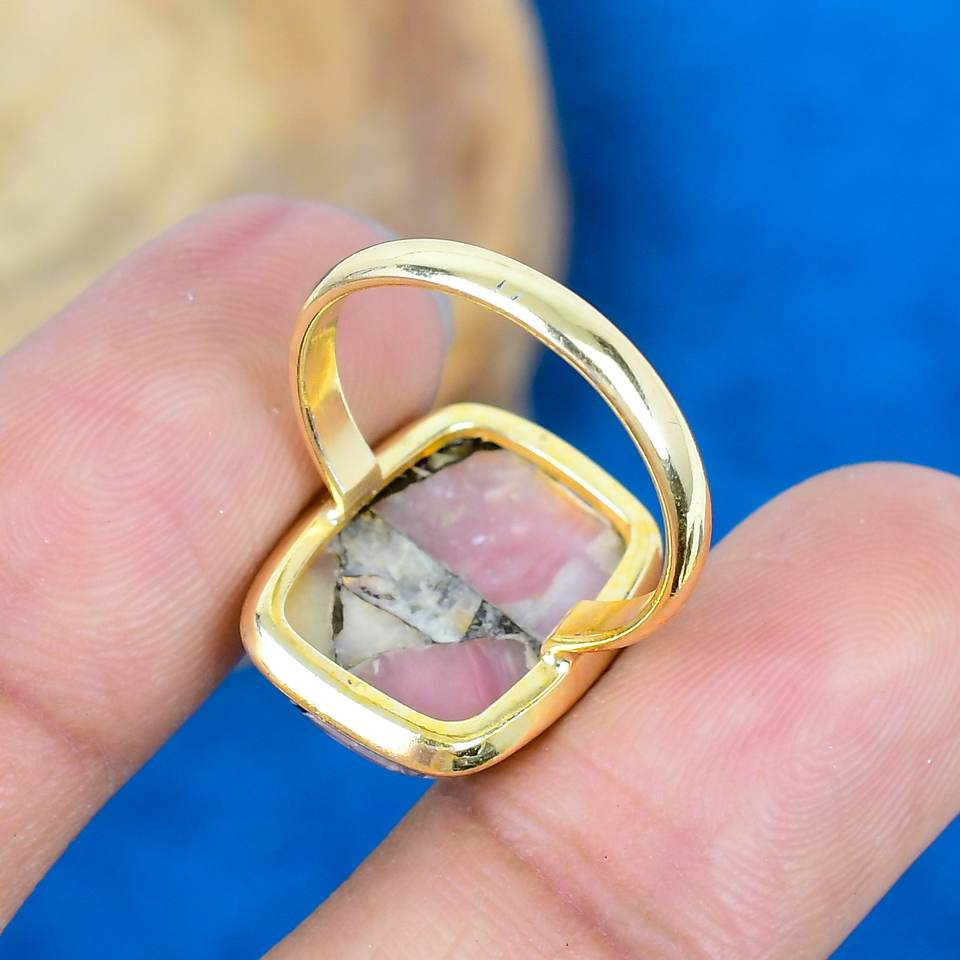 แหวนพลอยโอปอลสีชมพูธรรมชาติทรงคุชชั่น ประดับทอง 18k ชุบไมครอนบนเงินแท้ 925