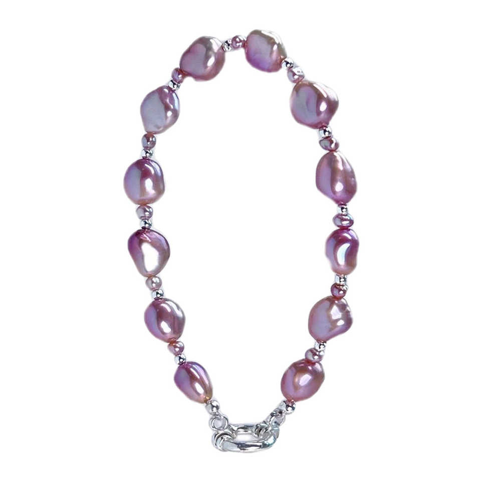 กำไลข้อมือเงินแท้ S925 ประดับมุกทรงบาร็อคสีชมพูม่วงธรรมชาติ ดีไซน์หรูหรา