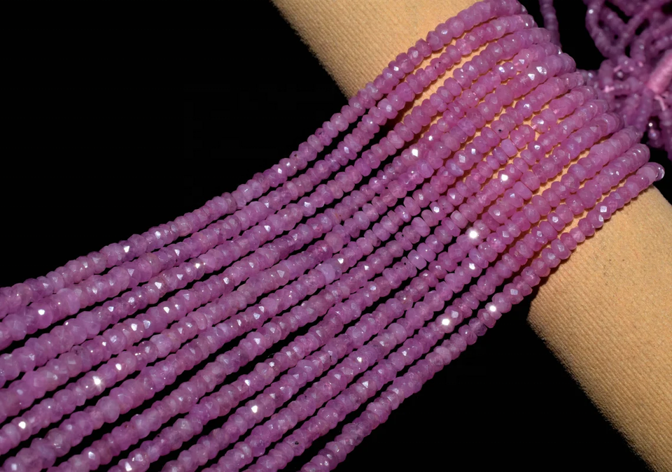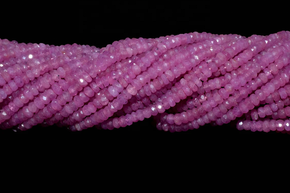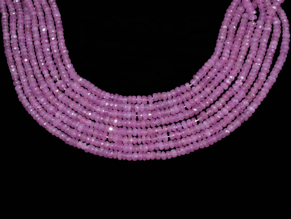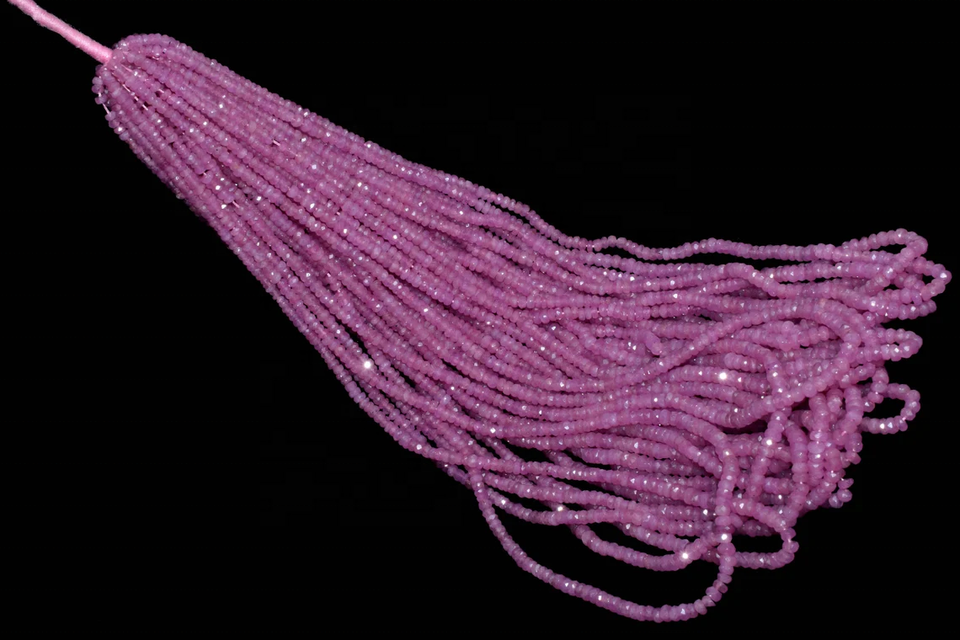 ลูกปัดแซฟไฟร์สีชมพูธรรมชาติทรงรอนเดลเหลี่ยมเพชรพลอย ขนาด 3 มม. ความยาว 16 นิ้ว เส้นผ่านศูนย์กลางรู 0.5 มม. น้ำหนักปรับแต่งได้สำหรับทำเครื่องประดับ