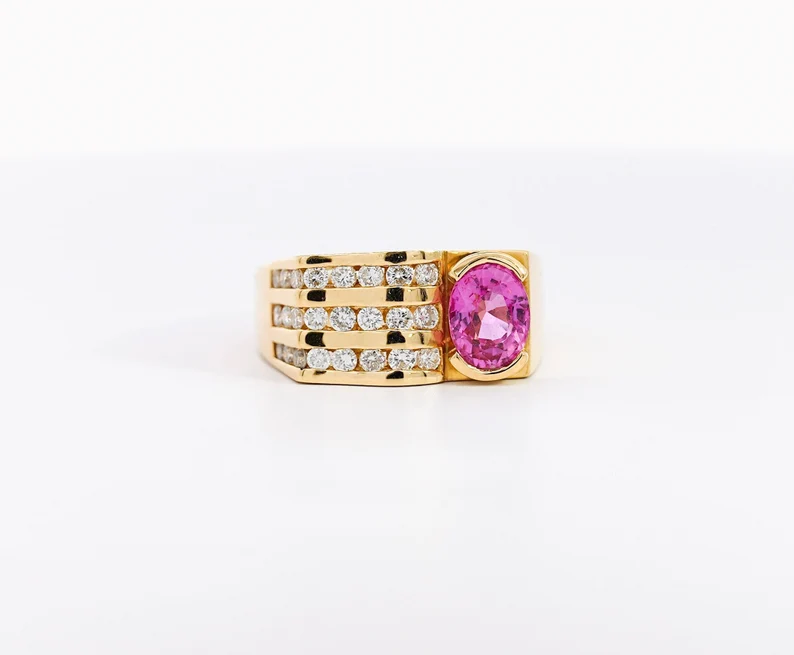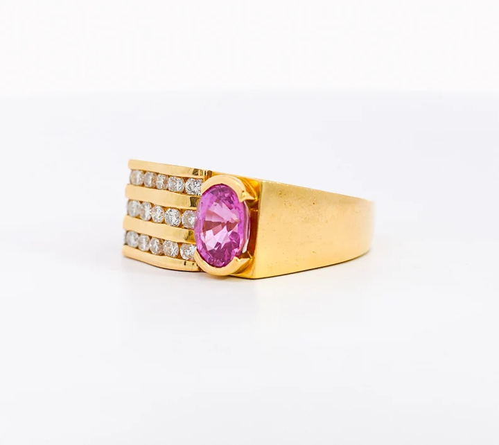 แหวนพลอยแซฟไฟร์ทรงวงรีสีชมพูธรรมชาติตัดเป็นครึ่งขอบพร้อมชุดช่องใส่เพชรสีเหลืองทอง18K