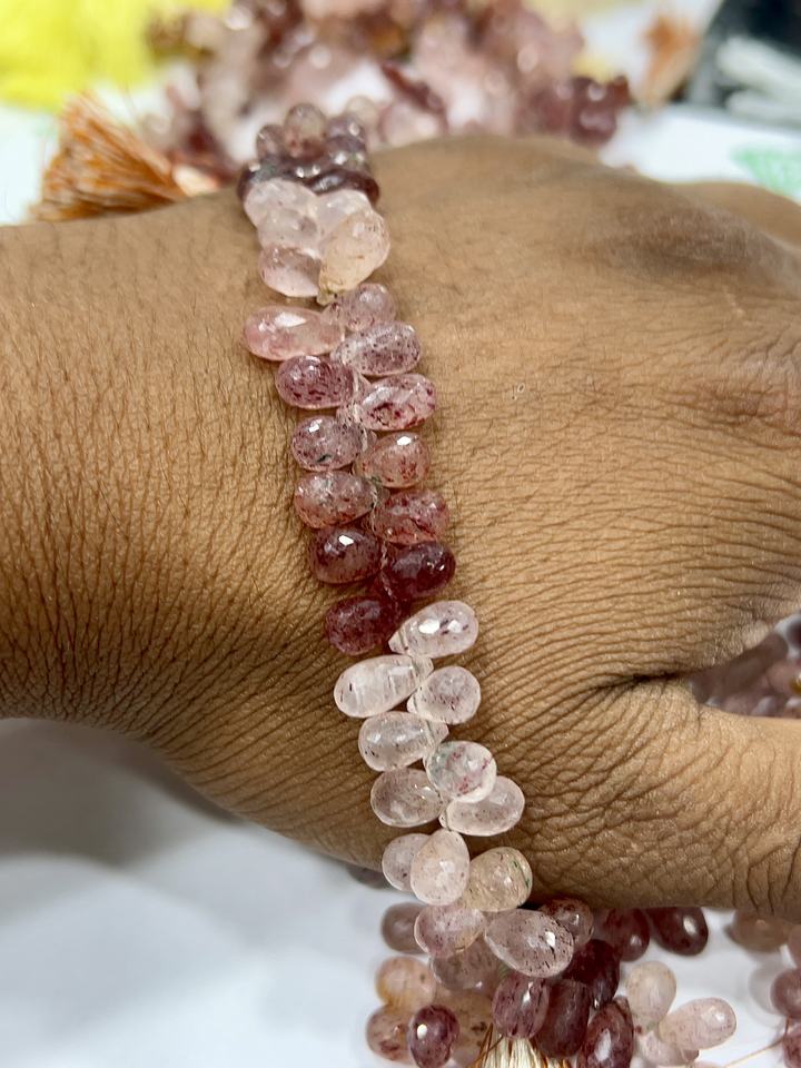 ควอตซ์สีชมพูธรรมชาติทรงหัวใจเหลี่ยมเพชรพลอยรูปหยดน้ำ ขนาด 8 นิ้ว ความยาว 5-7 มม. ลูกปัดพลอยสีน้ำตาล ได้รับการรับรองจาก GIA