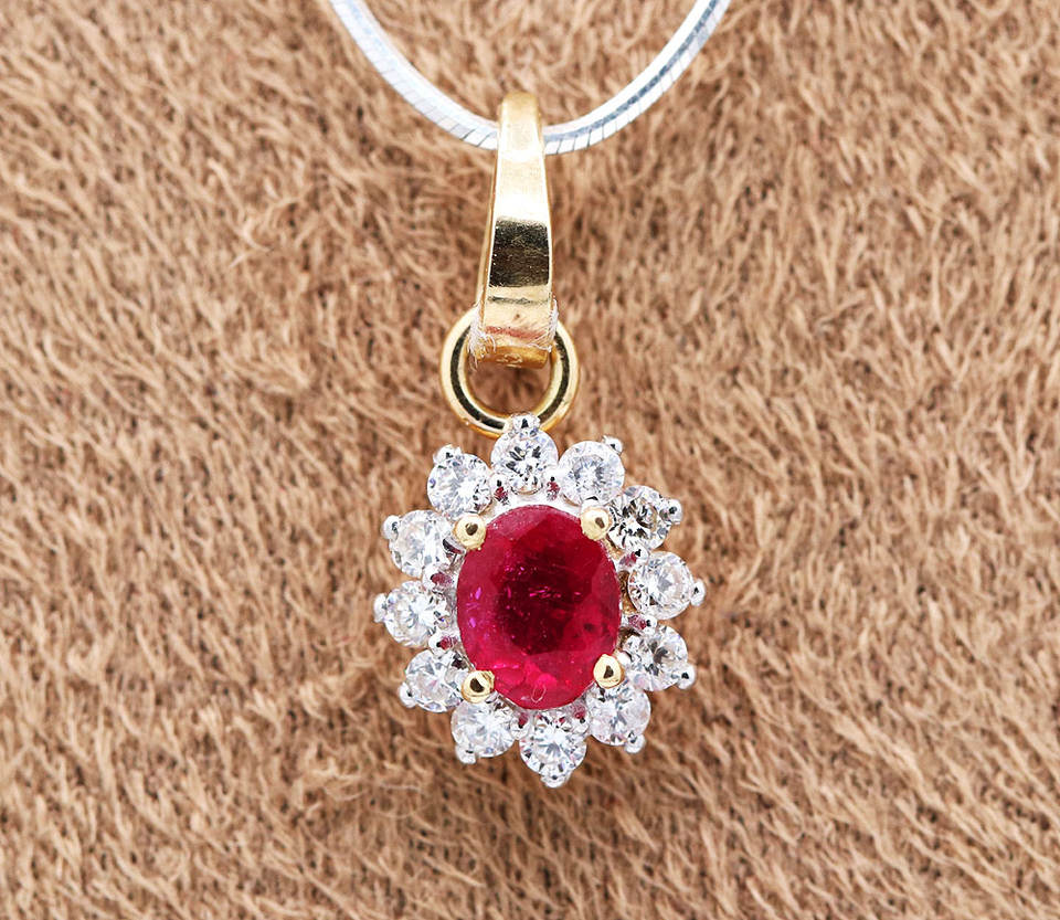 อัญมณีทับทิมและเพชรที่มีค่าธรรมชาติ14K จี้ทองคำสีเหลืองเข้มทำด้วยมือสำหรับผู้หญิงขายส่ง