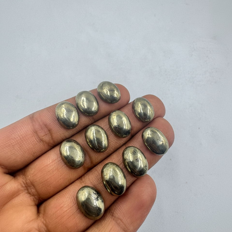 ไพไรต์สีทองธรรมชาติ รูปทรงวงรีเรียบ คุณภาพสูง พลอยหลวมสำหรับทำเครื่องประดับ พลอยขายส่ง ขนาด 10x14 มม. จากราชสถาน