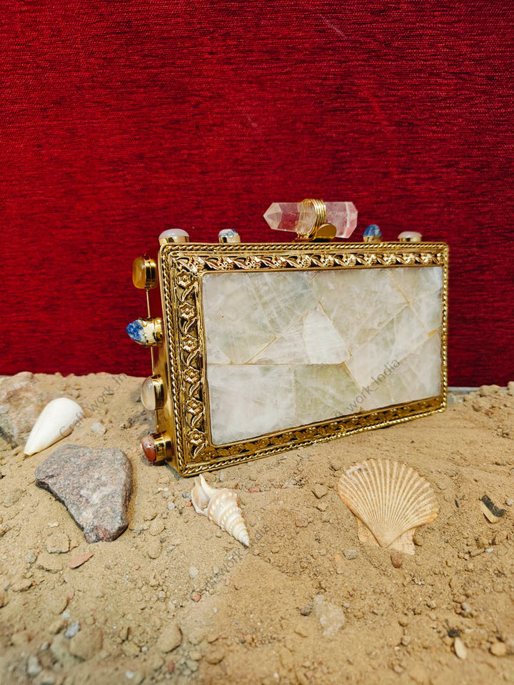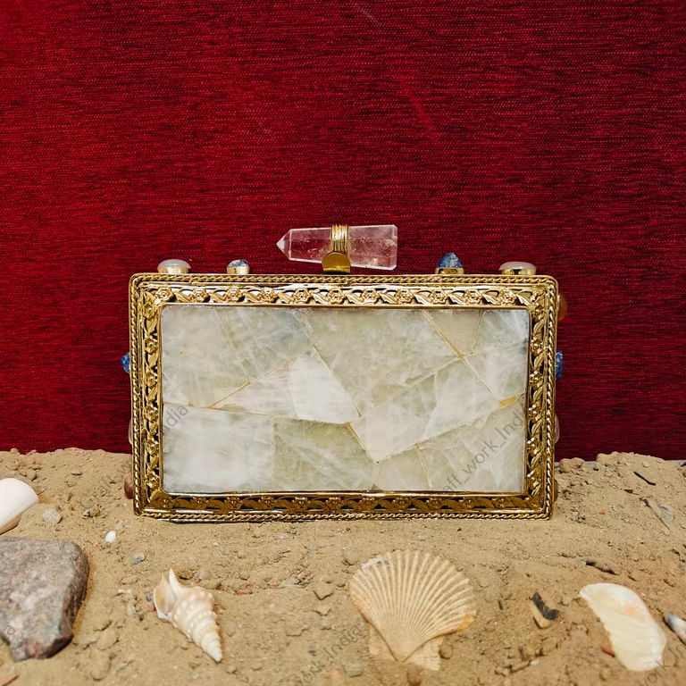 กระเป๋าคลัทช์หินควอตซ์ธรรมชาติ ประดับกรอบทอง ดีไซน์โมเสกหิน งานฝีมือสุดหรู