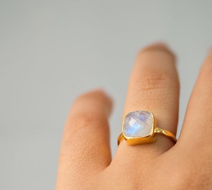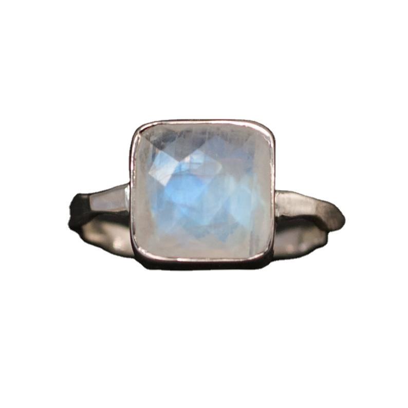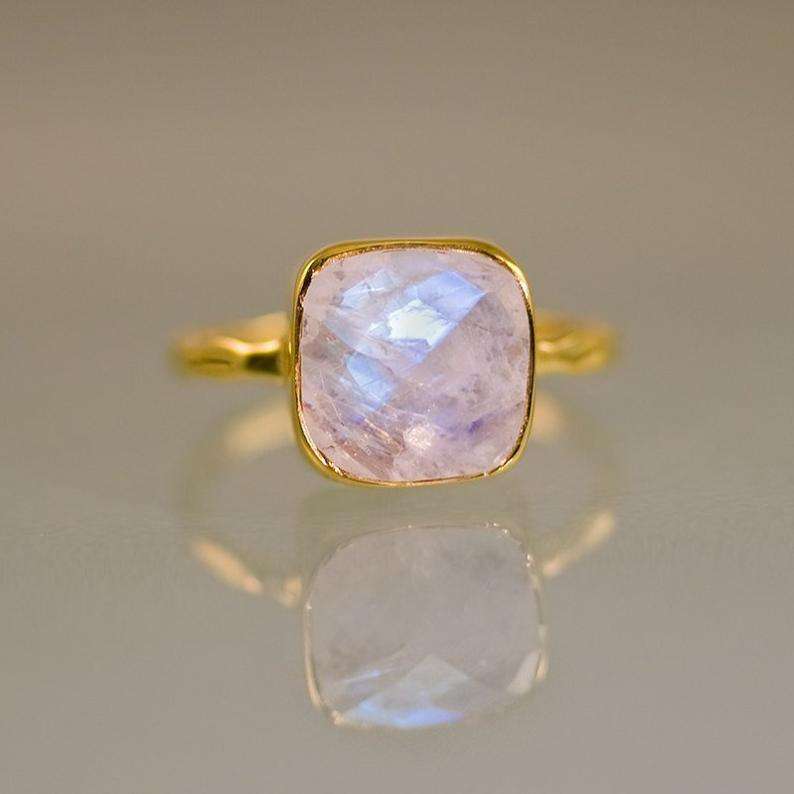 Natural Rainbow Moonstone 92.5 Sterling Silver Gold Polish Ring Faceted Square Shape Blue Fire Gemstone Wholesale