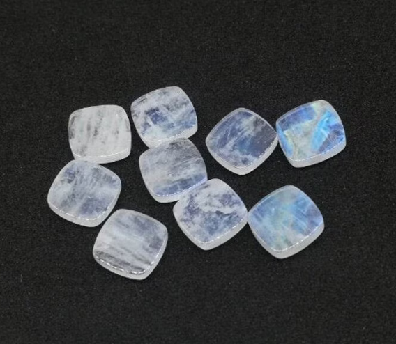 พลอยมูนสโตนสีรุ้งธรรมชาติทรงคุชชั่น แบบแบนทั้งสองด้าน พลอยสีน้ำเงินประกายไฟ สำหรับทำเครื่องประดับ เช่น สร้อยข้อมือ สร้อยคอ