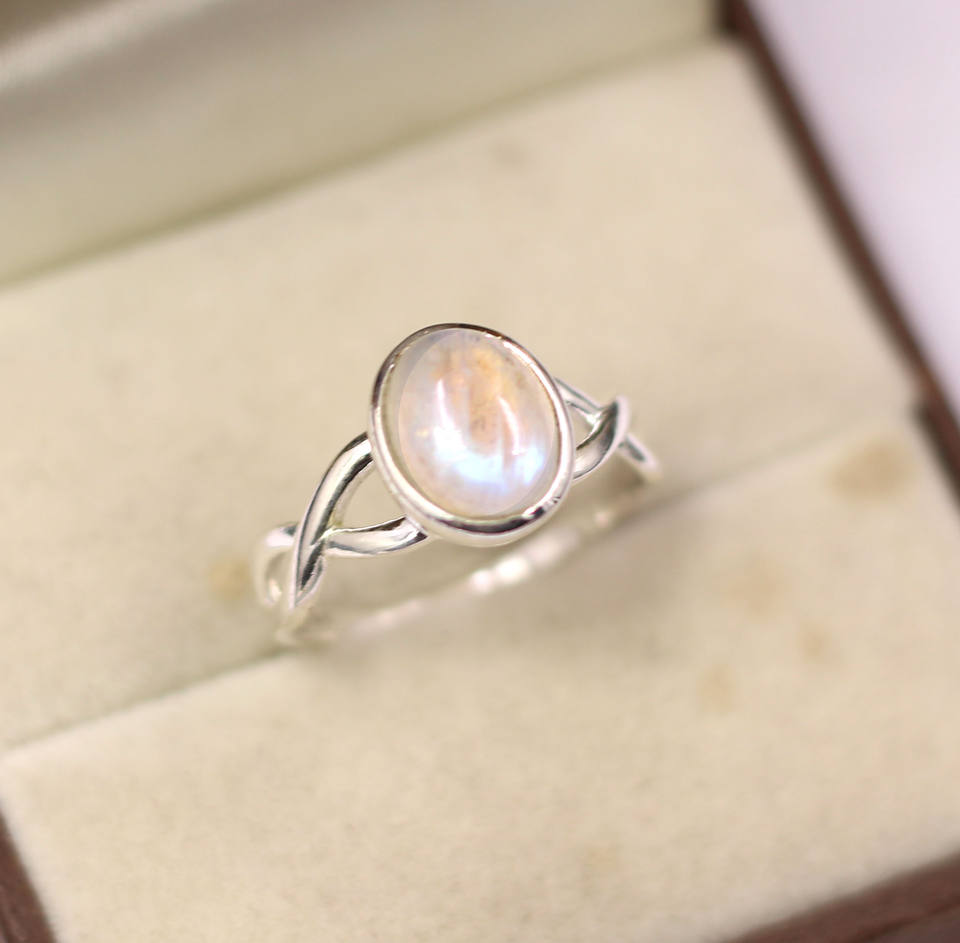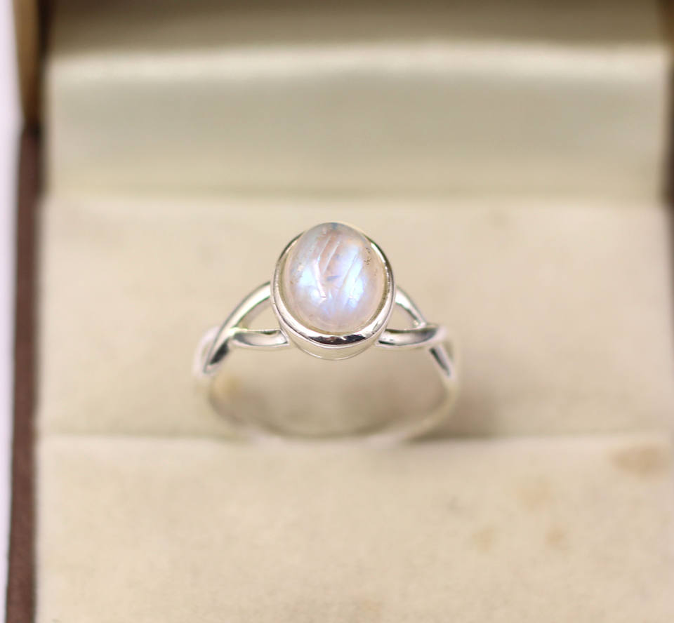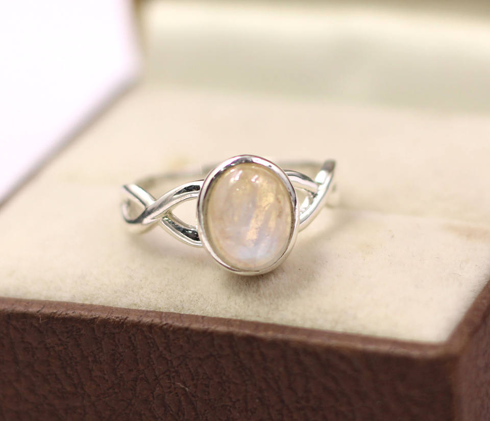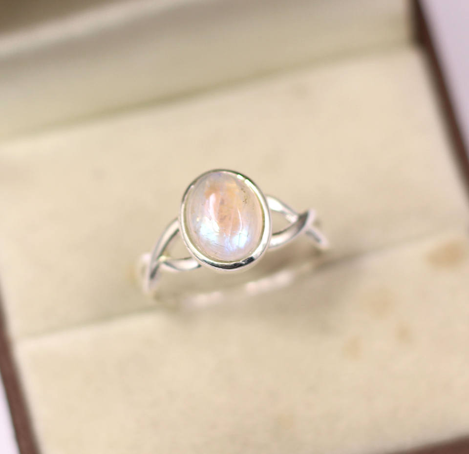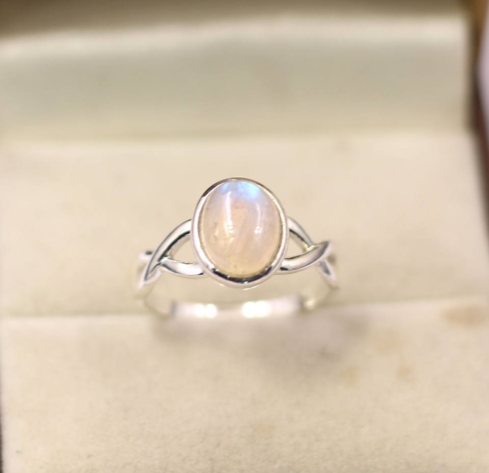 แหวนเงินแท้ 925 ชุบโรเดียม ประดับพลอยมูนสโตนสีรุ้งธรรมชาติ ดีไซน์ศาสนา ฝังแบบ Bezel ทำด้วยมือ