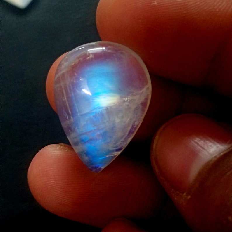 มูนสโตนสีรุ้งธรรมชาติทรงลูกแพร์แบบคาโบชอง ทำด้วยมือ พลอยสีขาว ประกายไฟชัดเจน รับรองโดยบุคคลที่สาม ขัดเคลือบด้วยน้ำมัน/แว็กซ์ น้ำหนัก 17-19 กะรัต