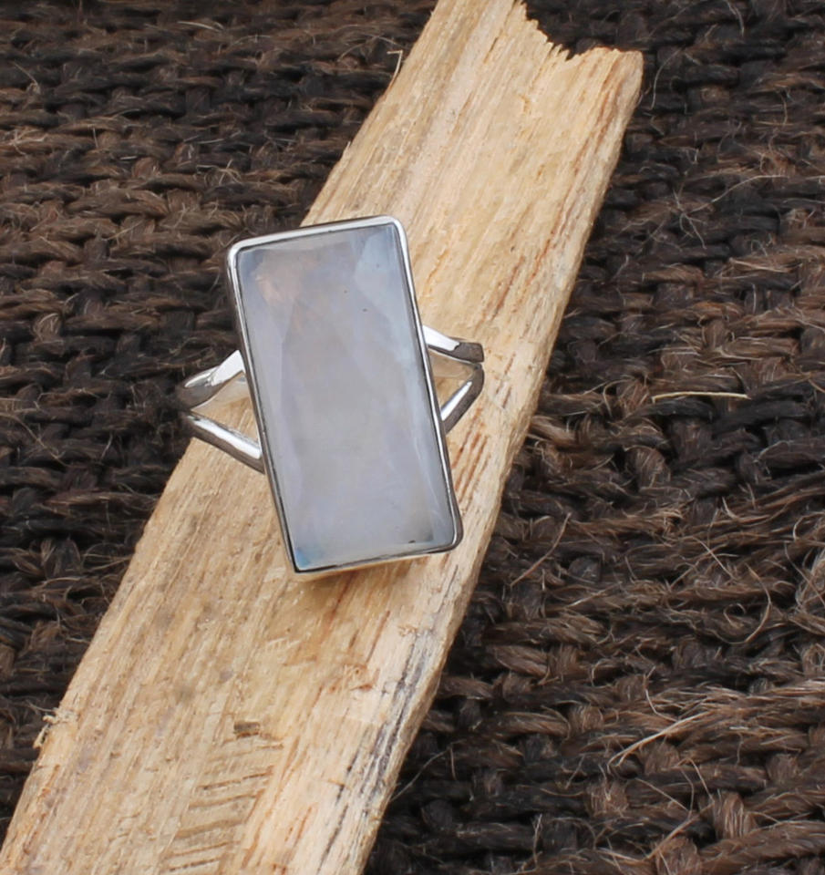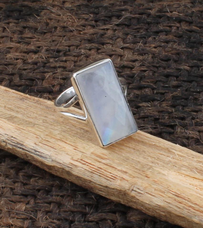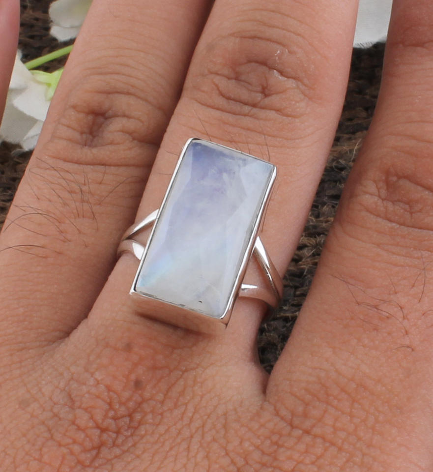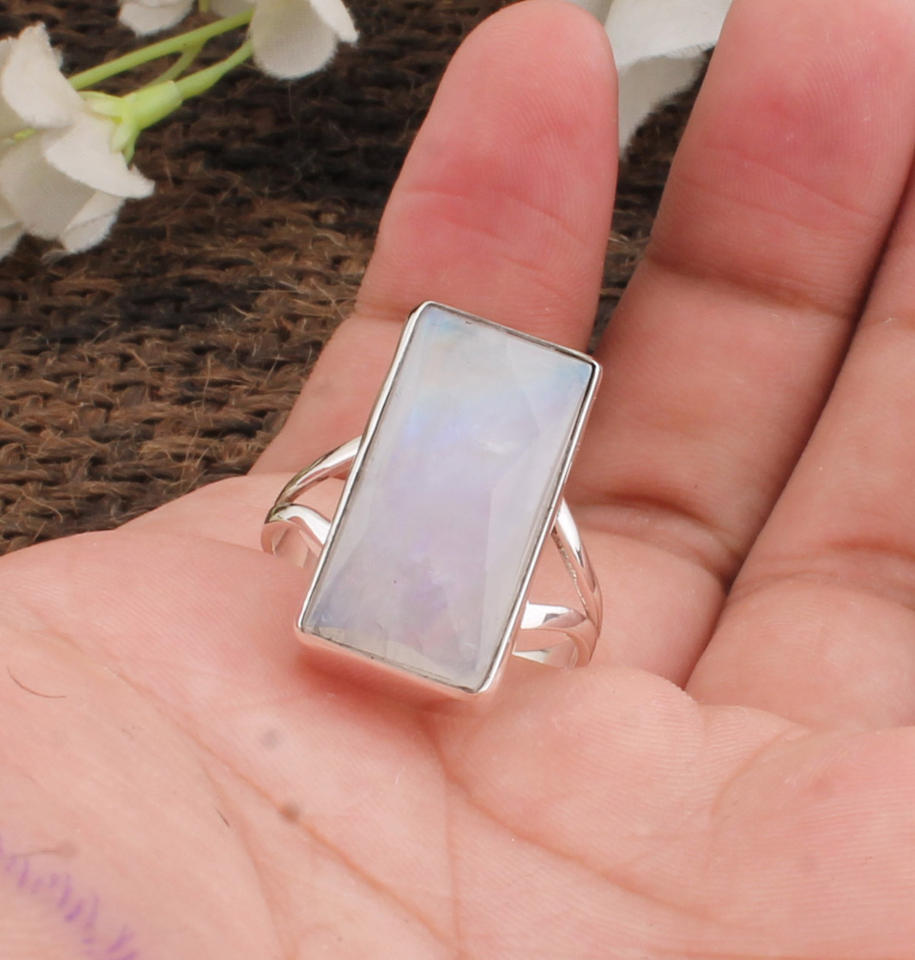แหวนเงินแท้ 925 ประดับมูนสโตนสีรุ้งธรรมชาติทรงสี่เหลี่ยม ดีไซน์ขอบเงิน งานแฮนด์เมดสำหรับผู้หญิง หินประจำเดือนเกิดเดือนมิถุนายน