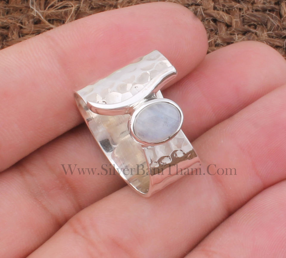 แหวนมูนสโตนสีรุ้งธรรมชาติ เงินแท้ 925 ประดับพลอยมูนสโตนสีน้ำเงิน ดีไซน์โบโฮมินิมอล ของขวัญวันครบรอบ