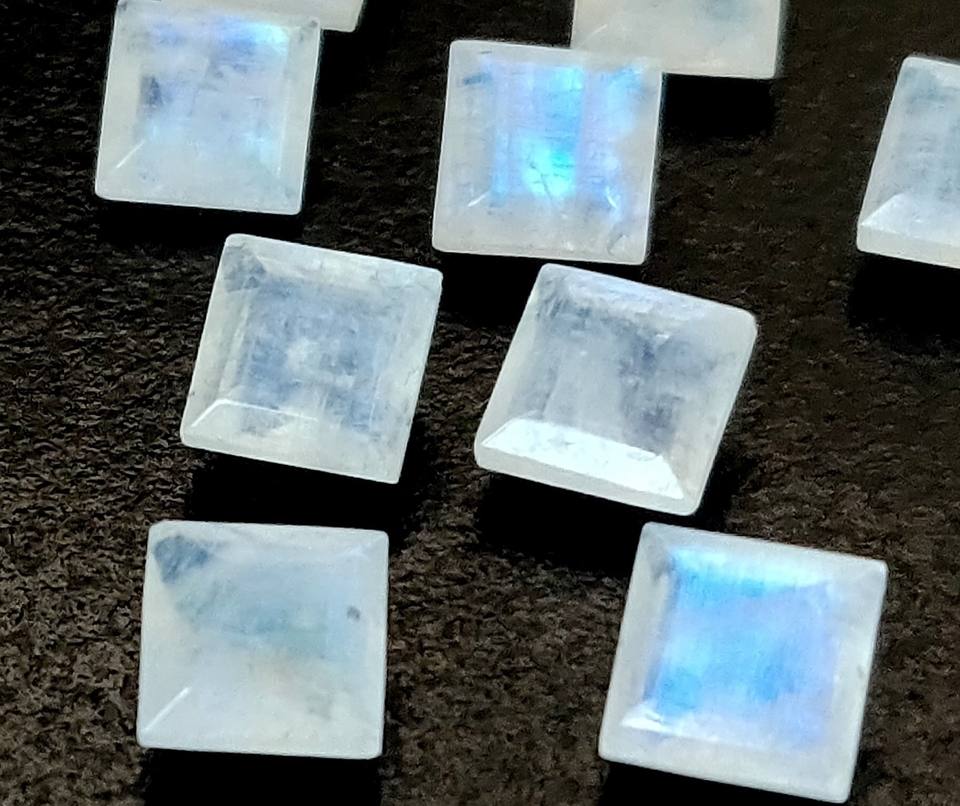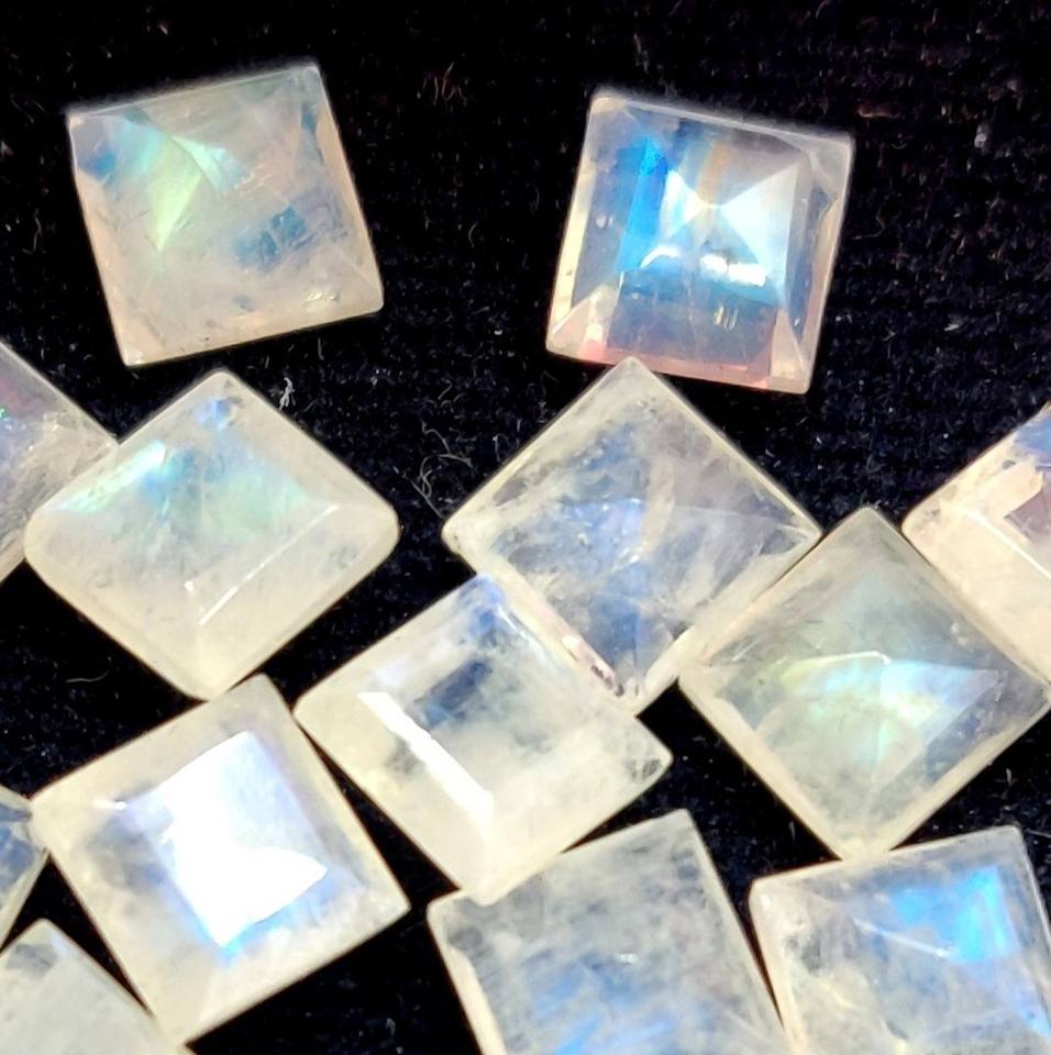 พลอยมูนสโตนสีรุ้งธรรมชาติ ทรงเหลี่ยม 8 มม. เจียระไนเหลี่ยมเพชรพลอย - ประกายสีฟ้าสวยงาม คุณภาพดี พลอยหลวม